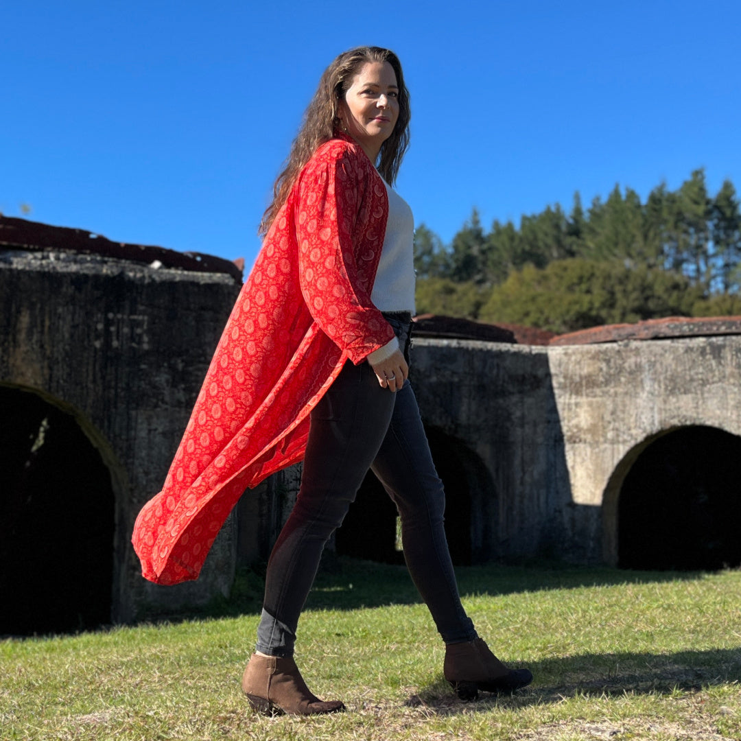 A truly stunning kimono in the kind of red you can't ignore and nor can anyone else. The gorgeous peacocks in the design put this garment in a category of it's own. When I wear it, I feel like a movie star from the golden era in Hollywood.