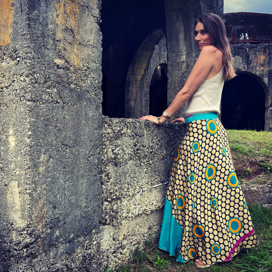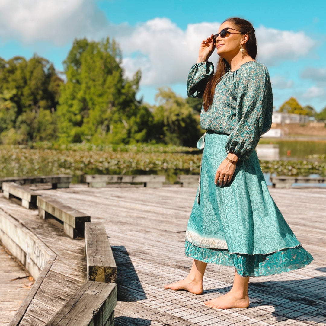 The skirt that will go with a top you already own. Made from a patchwork of recycled sari pieces. We cover size 10-28.
