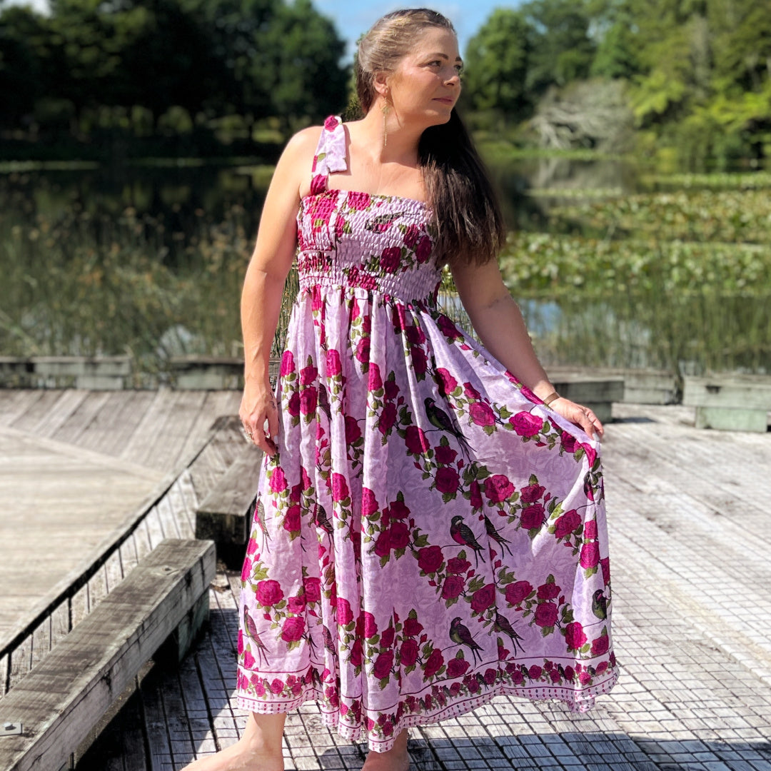A beautiful dress that can be tied either as a halter neck, straps over the shoulders or no straps at all. Sizes 10-28.
