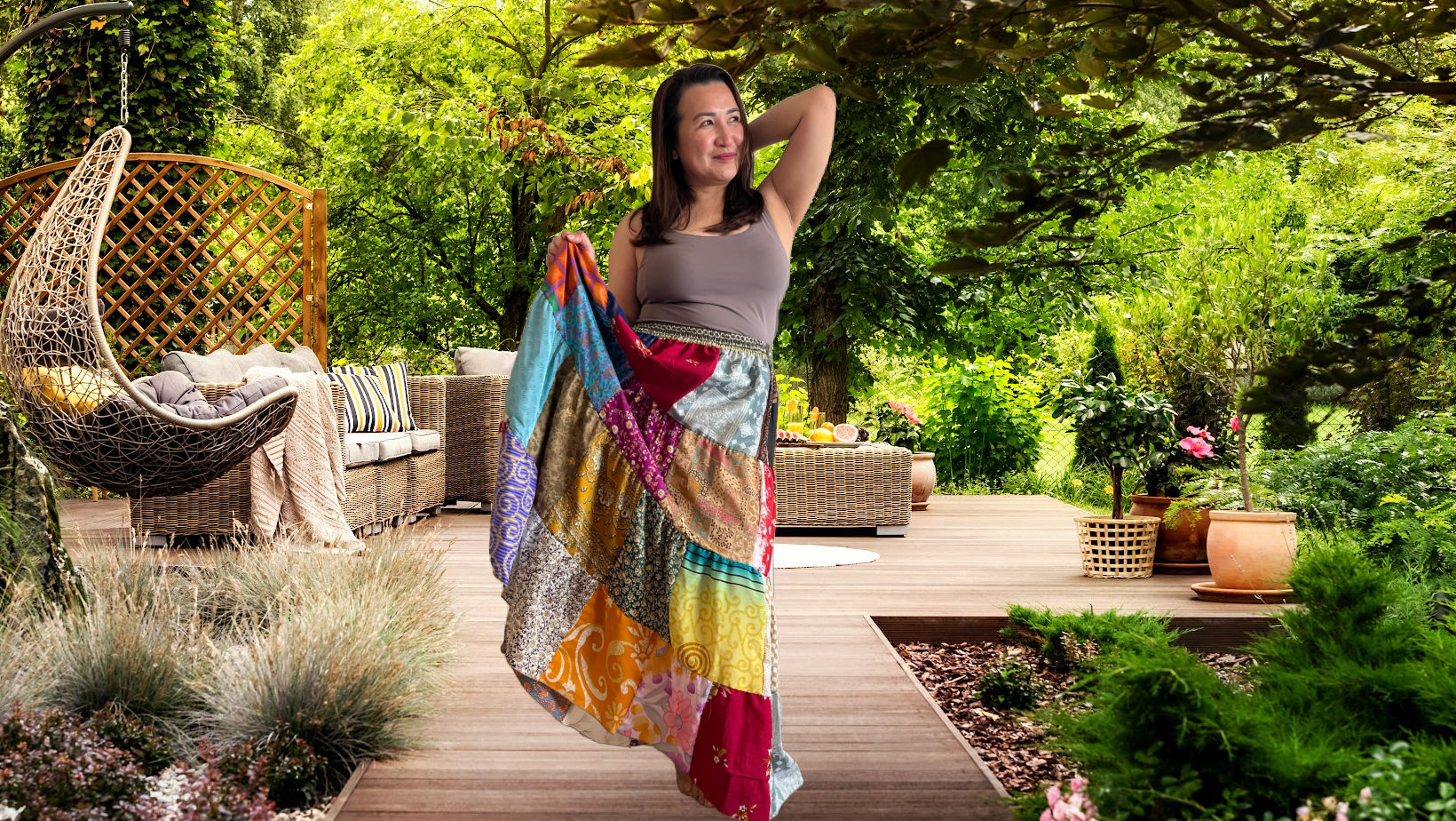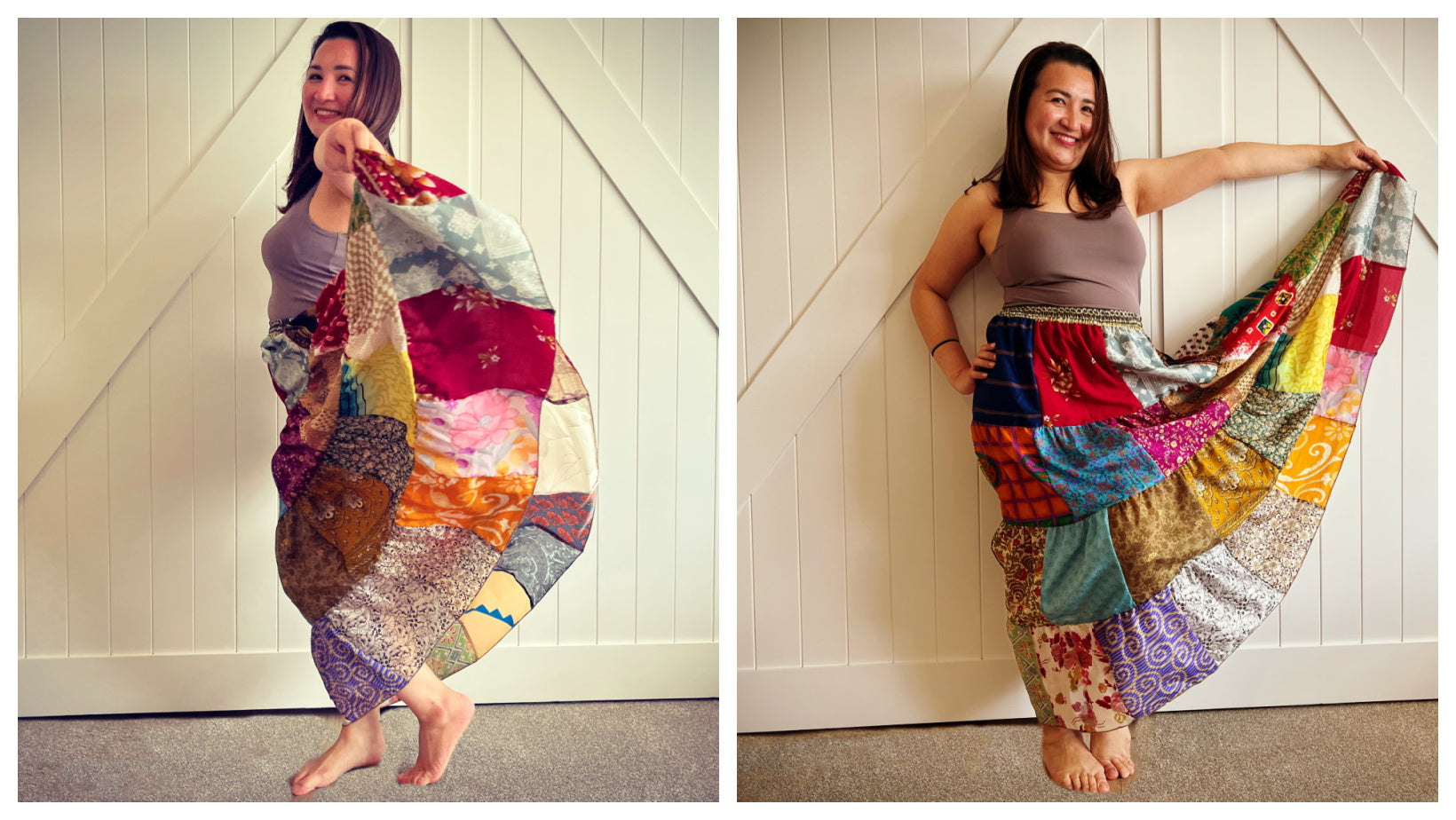 The image shows a sample skirt so you can see how they look as the fabrics used will vary for each one. Each skirt is unique. Click on the size you require.