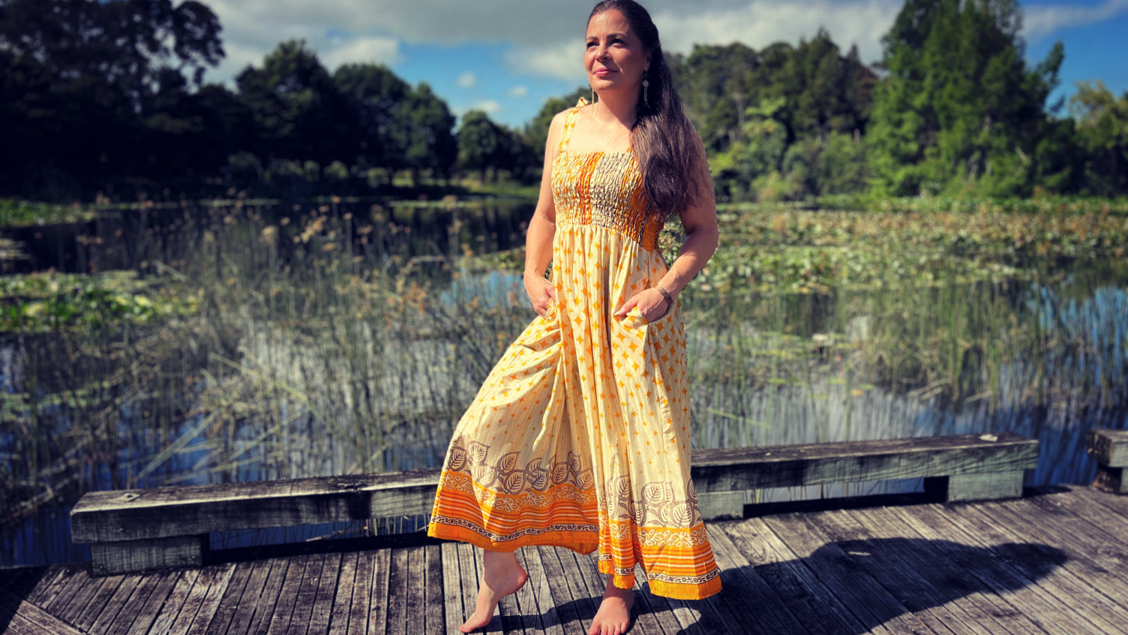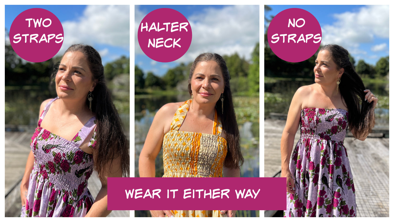 A beautiful dress that can be tied either as a halter neck, straps over the shoulders or no straps at all. The ties tuck neatly inside when not in use. There are two internal side pockets in the skirt.