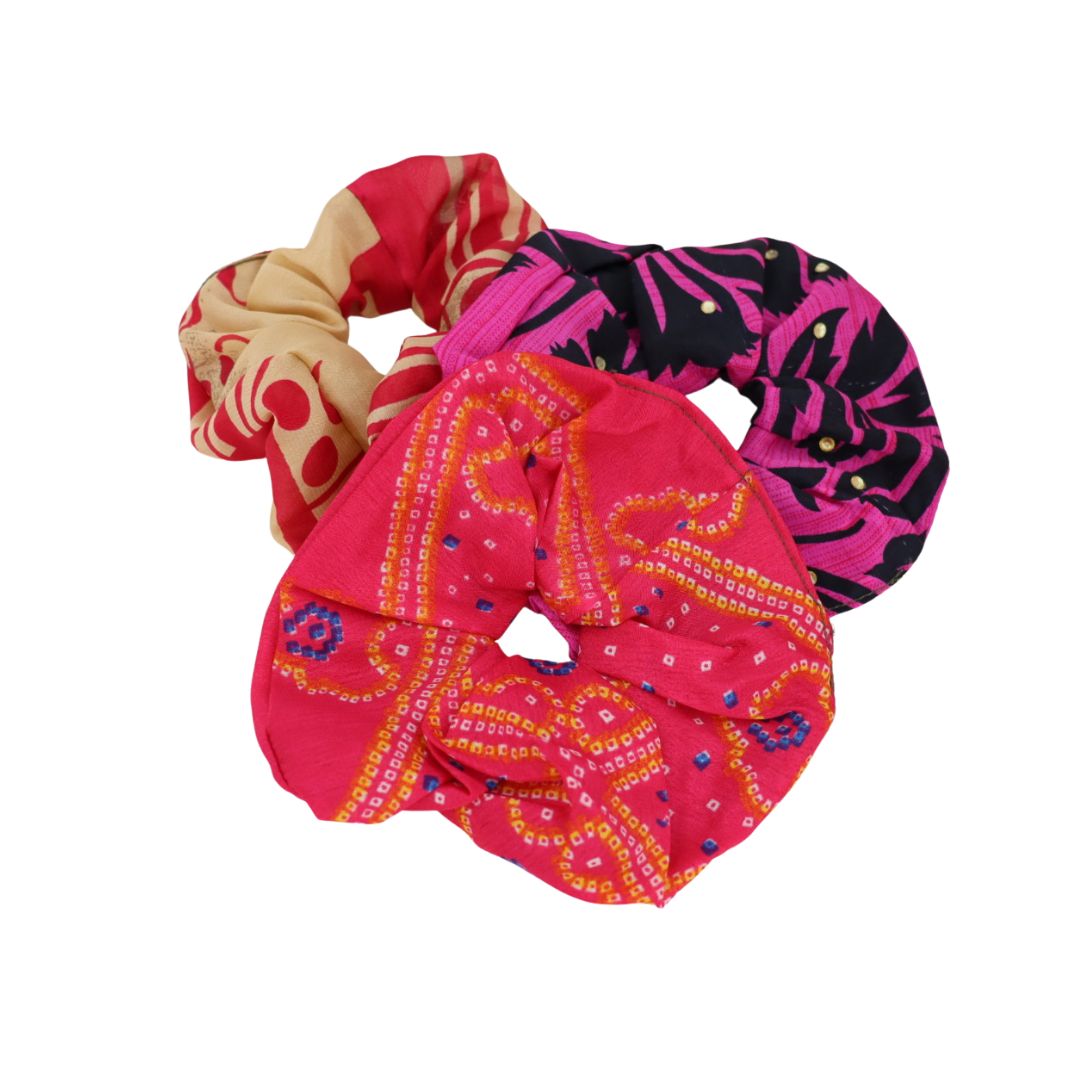 The best scrunchies on the planet and for the planet. Made from up-cycled silk blend sari fabrics just like our other garments, these scrunchies come in packs or singles so you can enjoy wearing pretty fabrics in your hair.