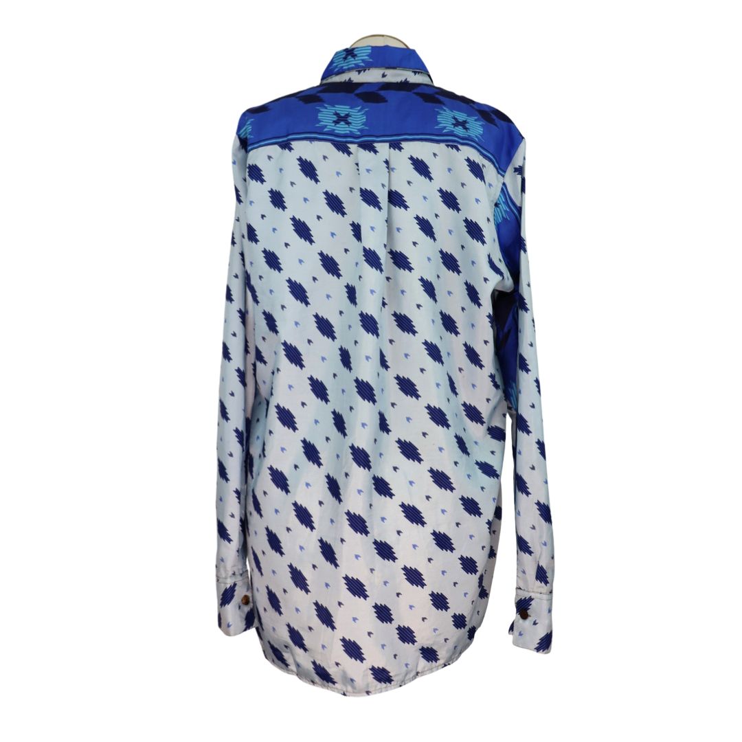 You'll receive this shirt. Since each one is lovingly hand made from an up-cycled silk blend sari, you may find tiny imperfections in the fabric.