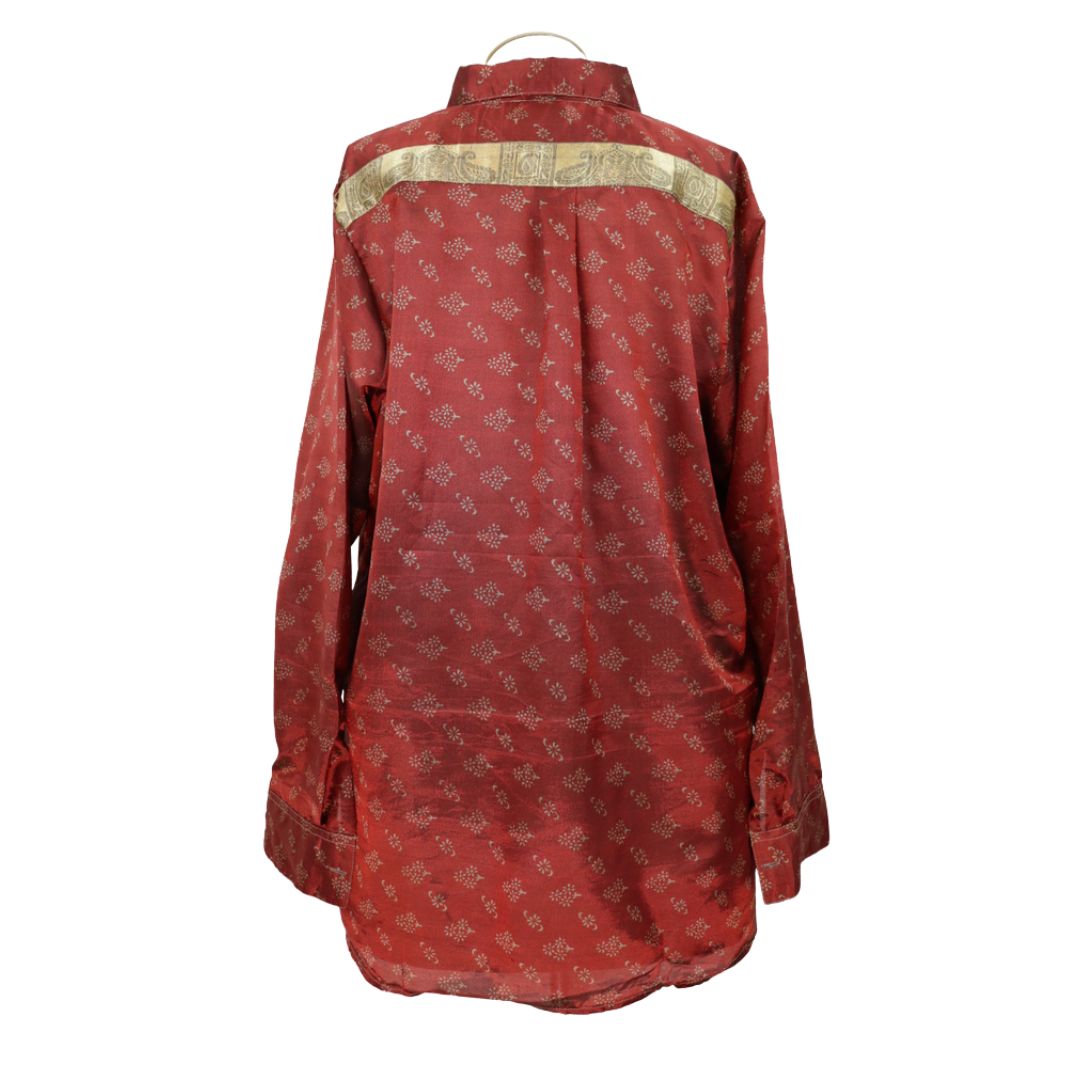 You'll receive this shirt. Since each one is lovingly hand made from an up-cycled silk blend sari, you may find tiny imperfections in the fabric. Occasionally an artisan may place a sequin or other small replica jewels over an imperfection.