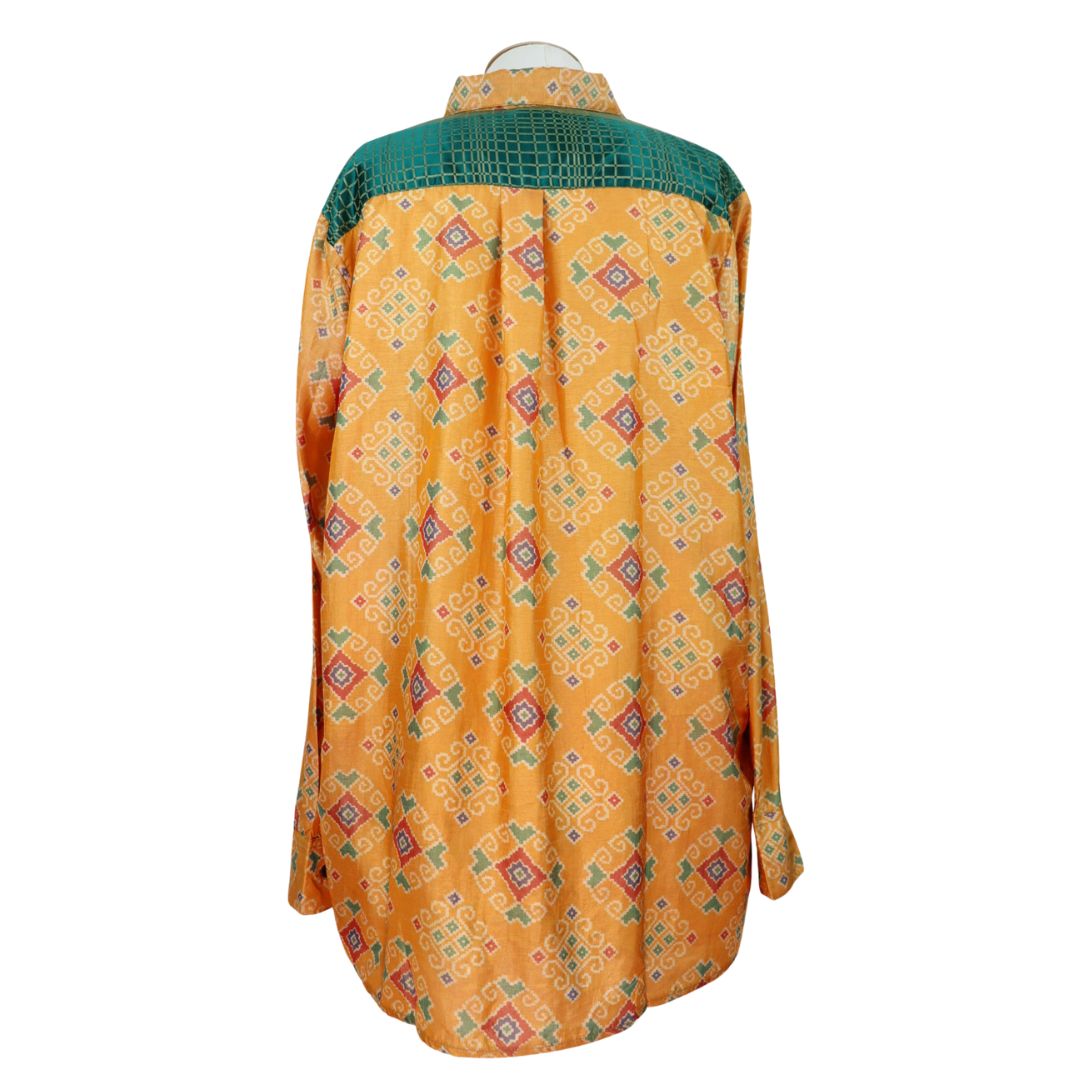 You'll receive this shirt. Since each one is lovingly hand made from an up-cycled silk blend sari, you may find tiny imperfections in the fabric. Occasionally an artisan may place a sequin or other small replica jewels over an imperfection.