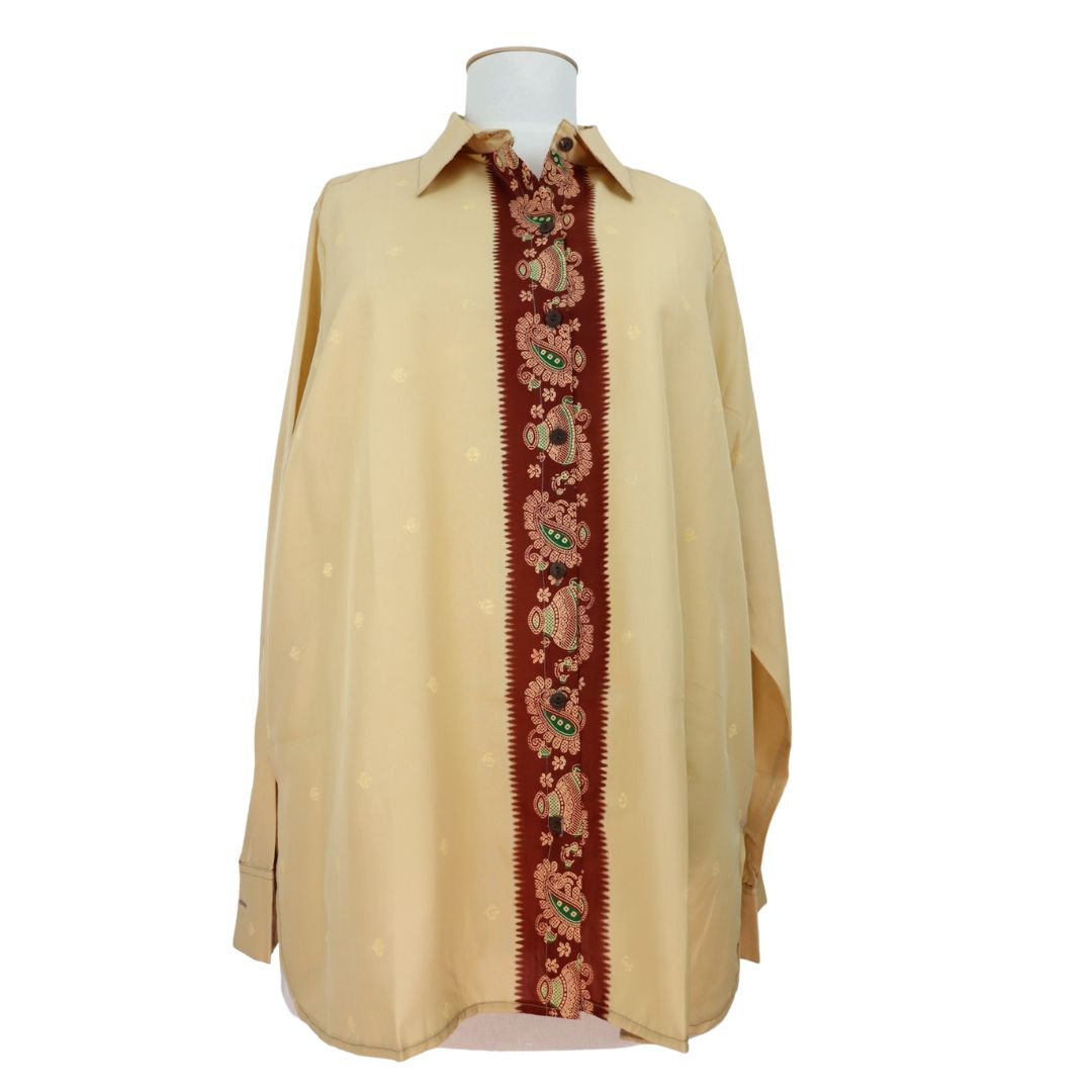 You'll receive this shirt. Since each one is lovingly hand made from an up-cycled silk blend sari, you may find tiny imperfections in the fabric. Occasionally an artisan may place a sequin or other small replica jewels over an imperfection.