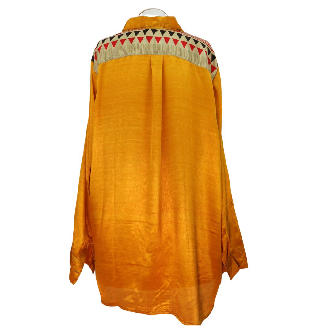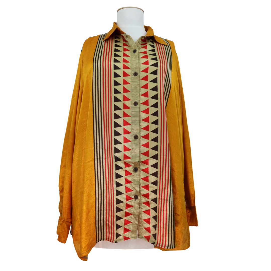 You'll receive this shirt. Since each one is lovingly hand made from an up-cycled silk blend sari, you may find tiny imperfections in the fabric. Occasionally an artisan may place a sequin or other small replica jewels over an imperfection.