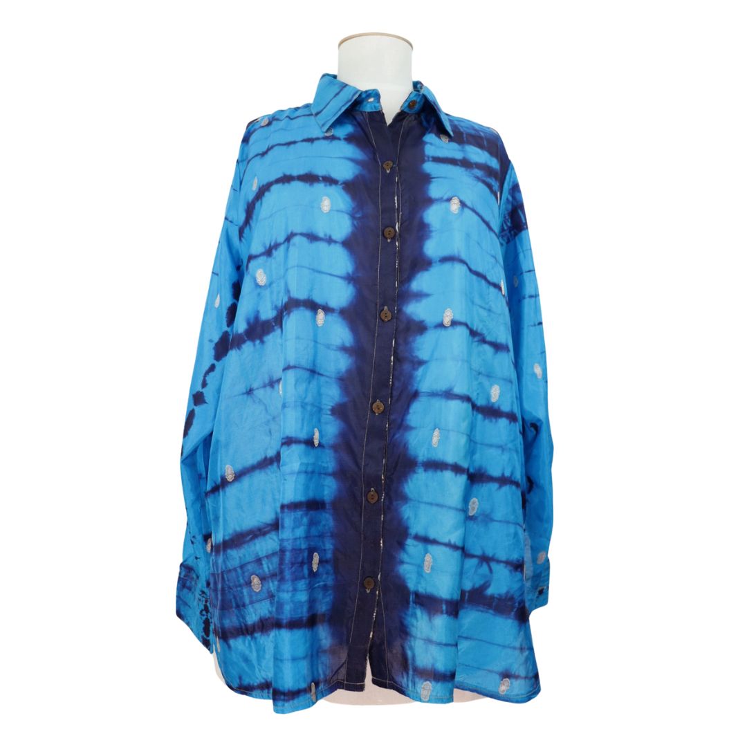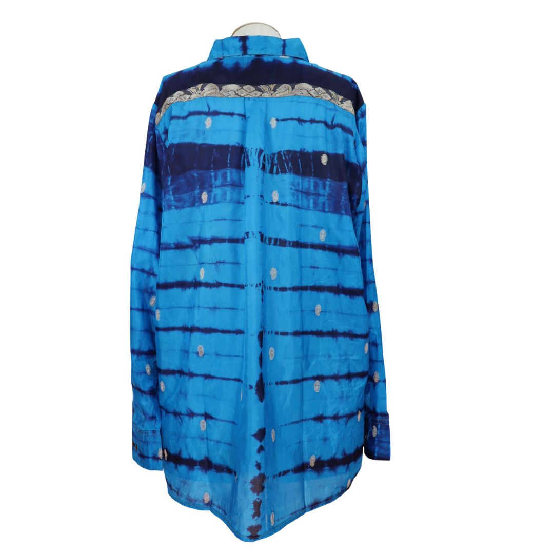 You'll receive this shirt. Since each one is lovingly hand made from an up-cycled silk blend sari, you may find tiny imperfections in the fabric. Occasionally an artisan may place a sequin or other small replica jewels over an imperfection.