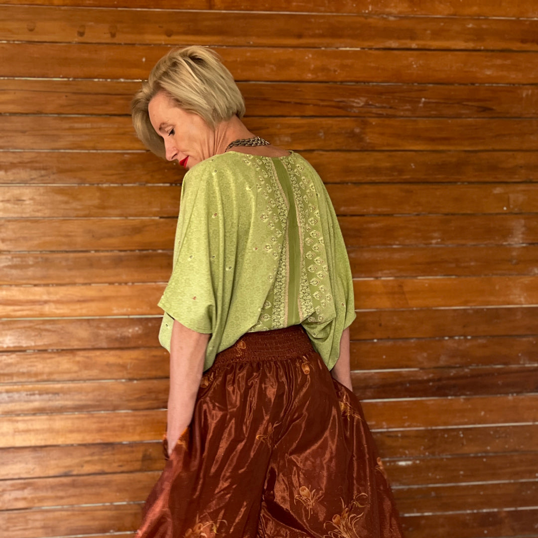 Just like our sari wrap skirts, the batwing tops are made from recycled silk blend saris and each one is unique.