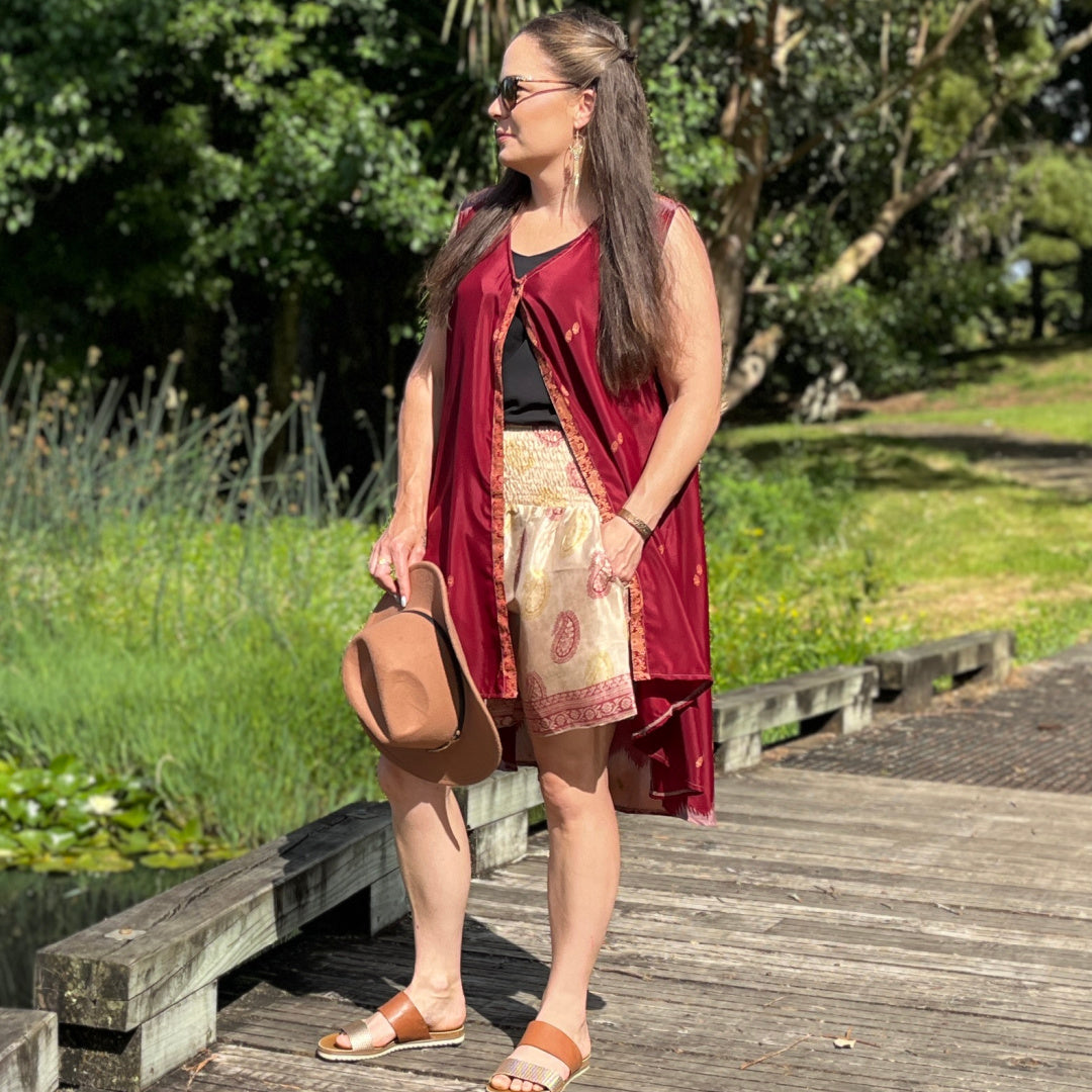 Add colour to your wardrobe with a unique piece to layer with. This sleeveless top / waistcoat has a single button to fasten it allowing the garment to float with you. Made from recycled saris.