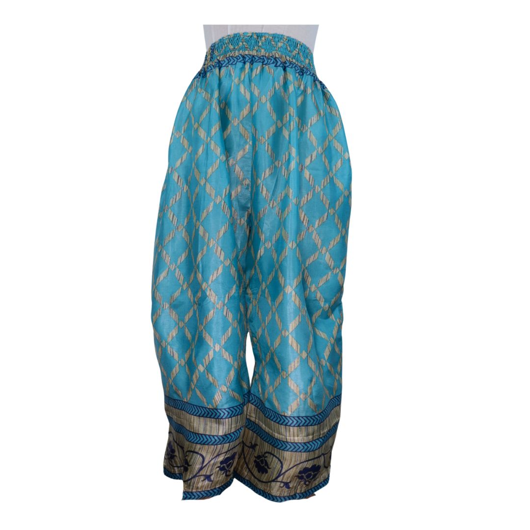Traditionally Saris are often flamboyant and brightly coloured, frequently embroidered, and made from silk, cotton, or, in recent years, synthetic cloth such as viscose and polyester. We use retro Sari cloth in the majority of our garments so silk is a high component. It is not uncommon to find chiffon or georgette added into the mix which is why we refer to the skirts as a silk blend. We also use 'end of roll' sari fabrics.
