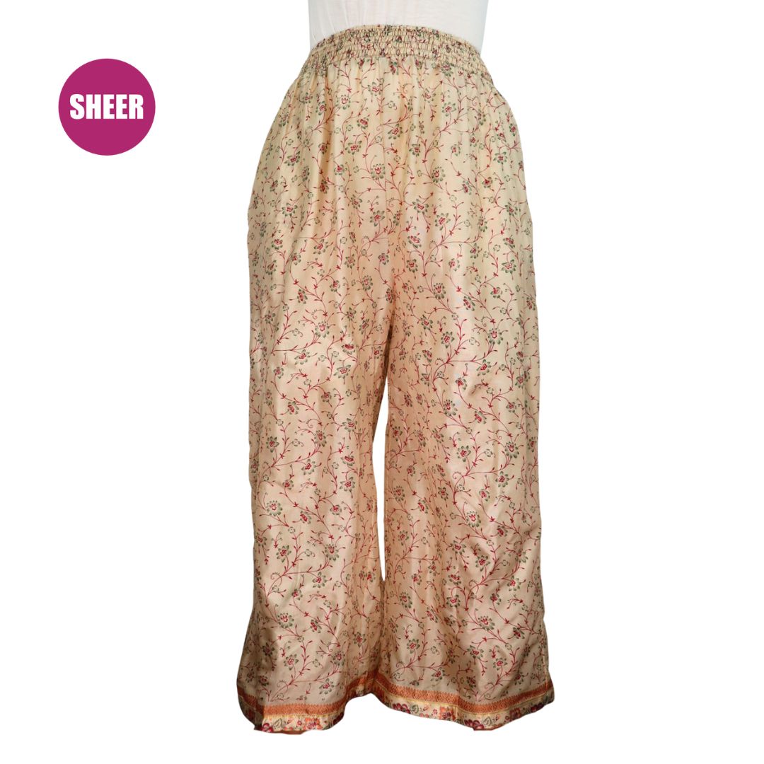 Traditionally Saris are often flamboyant and brightly coloured, frequently embroidered, and made from silk, cotton, or, in recent years, synthetic cloth such as viscose and polyester. We use retro Sari cloth in the majority of our garments so silk is a high component. It is not uncommon to find chiffon or georgette added into the mix which is why we refer to the skirts as a silk blend. We also use 'end of roll' sari fabrics.