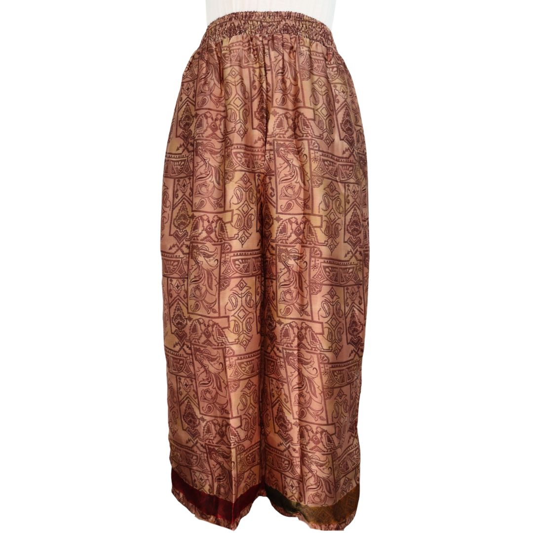 Traditionally Saris are often flamboyant and brightly coloured, frequently embroidered, and made from silk, cotton, or, in recent years, synthetic cloth such as viscose and polyester. We use retro Sari cloth in the majority of our garments so silk is a high component. It is not uncommon to find chiffon or georgette added into the mix which is why we refer to the skirts as a silk blend. We also use 'end of roll' sari fabrics.