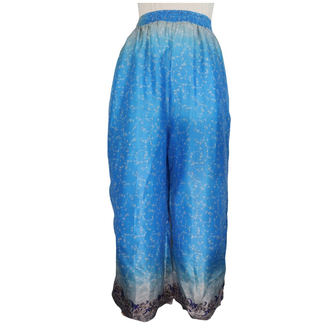 Traditionally Saris are often flamboyant and brightly coloured, frequently embroidered, and made from silk, cotton, or, in recent years, synthetic cloth such as viscose and polyester. We use retro Sari cloth in the majority of our garments so silk is a high component. It is not uncommon to find chiffon or georgette added into the mix which is why we refer to the skirts as a silk blend. We also use 'end of roll' sari fabrics.