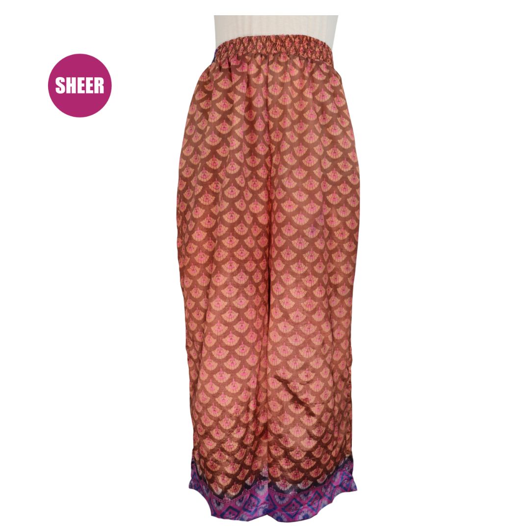 Traditionally Saris are often flamboyant and brightly coloured, frequently embroidered, and made from silk, cotton, or, in recent years, synthetic cloth such as viscose and polyester. We use retro Sari cloth in the majority of our garments so silk is a high component. It is not uncommon to find chiffon or georgette added into the mix which is why we refer to the skirts as a silk blend. We also use 'end of roll' sari fabrics.