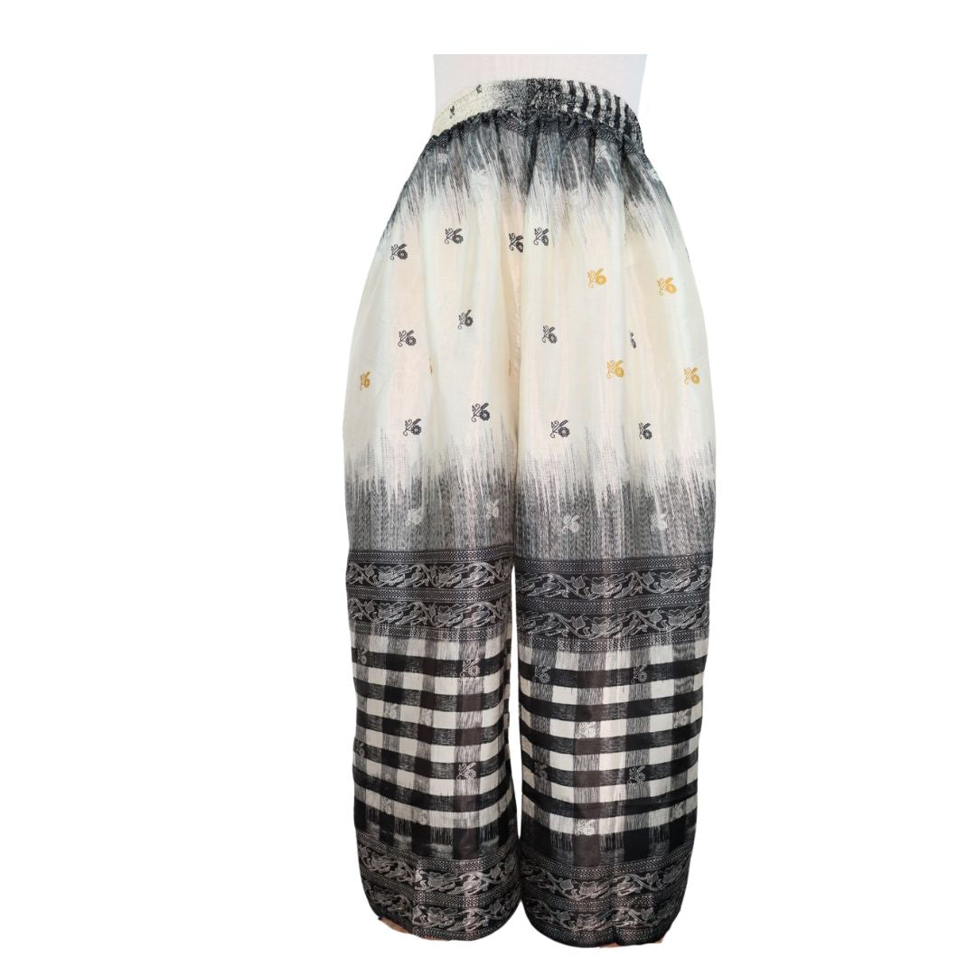 Traditionally Saris are often flamboyant and brightly coloured, frequently embroidered, and made from silk, cotton, or, in recent years, synthetic cloth such as viscose and polyester. We use retro Sari cloth in the majority of our garments so silk is a high component. It is not uncommon to find chiffon or georgette added into the mix which is why we refer to the skirts as a silk blend. We also use 'end of roll' sari fabrics.