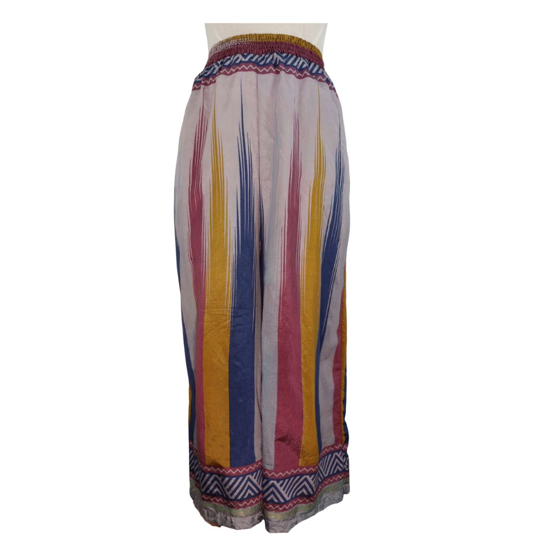 Traditionally Saris are often flamboyant and brightly coloured, frequently embroidered, and made from silk, cotton, or, in recent years, synthetic cloth such as viscose and polyester. We use retro Sari cloth in the majority of our garments so silk is a high component. It is not uncommon to find chiffon or georgette added into the mix which is why we refer to the skirts as a silk blend. We also use 'end of roll' sari fabrics.