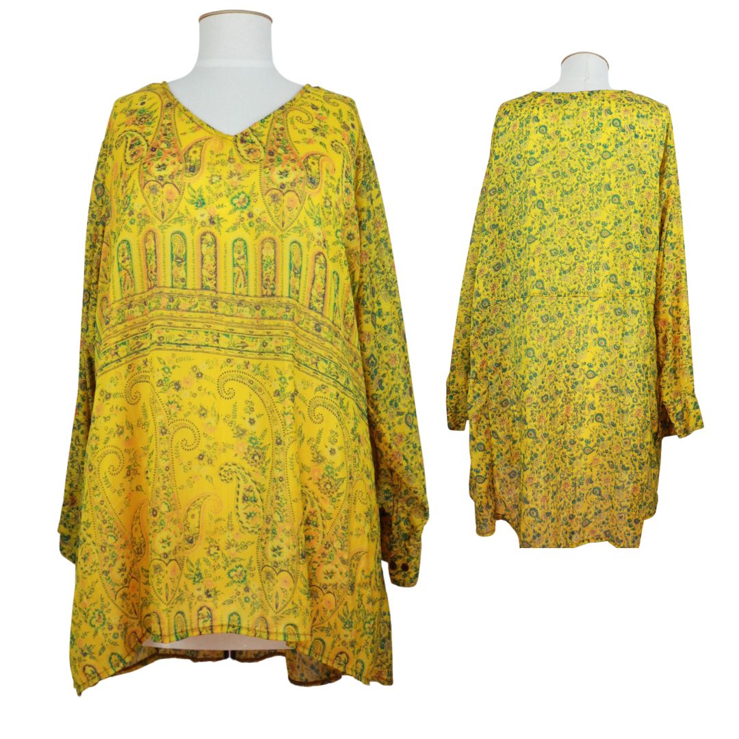 Lovely print and colour, great with palazzo pants or could be a beach cover up top, very versatile. Very comfy