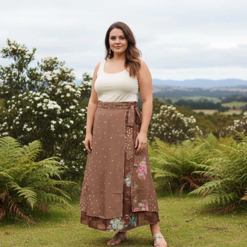 Traditionally Saris are often flamboyant and brightly coloured, frequently embroidered, and made from silk, cotton, or, in recent years, synthetic cloth such as viscose and polyester. We use retro Sari cloth in the majority of our garments so silk is a high component. It is not uncommon to find chiffon or georgette added into the mix which is why we refer to the skirts as a silk blend. We also use 'end of roll' sari fabrics.