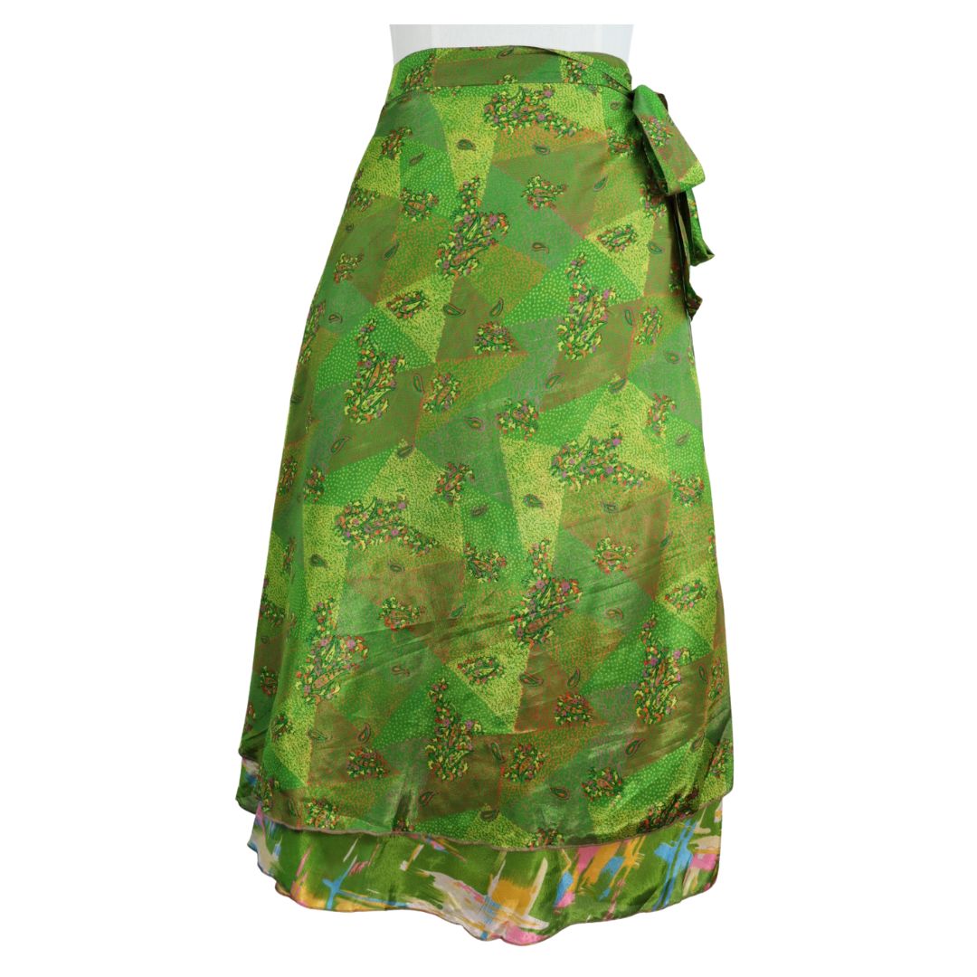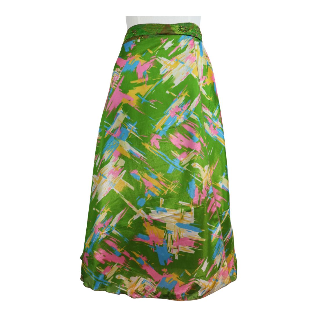 Traditionally Saris are often flamboyant and brightly coloured, frequently embroidered, and made from silk, cotton, or, in recent years, synthetic cloth such as viscose and polyester. We use retro Sari cloth in the majority of our garments so silk is a high component. It is not uncommon to find chiffon or georgette added into the mix which is why we refer to the skirts as a silk blend. We also use 'end of roll' sari fabrics.