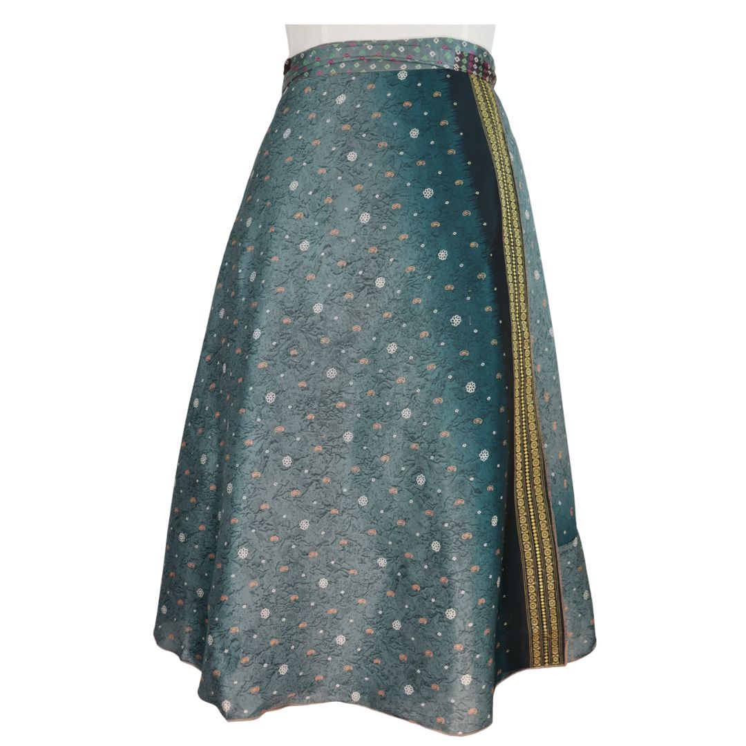 Traditionally Saris are often flamboyant and brightly coloured, frequently embroidered, and made from silk, cotton, or, in recent years, synthetic cloth such as viscose and polyester. We use retro Sari cloth in the majority of our garments so silk is a high component. It is not uncommon to find chiffon or georgette added into the mix which is why we refer to the skirts as a silk blend. We also use 'end of roll' sari fabrics.