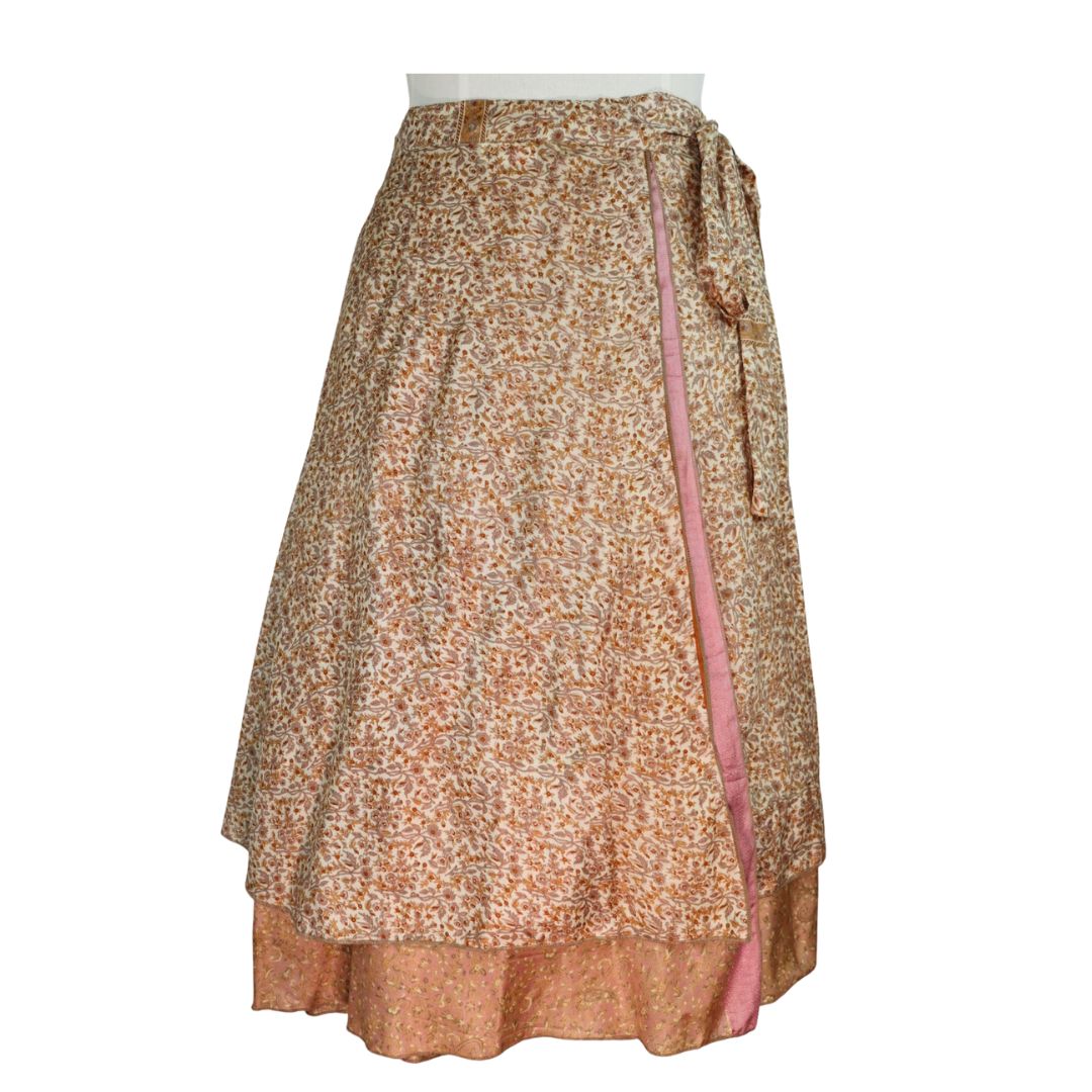 Traditionally Saris are often flamboyant and brightly coloured, frequently embroidered, and made from silk, cotton, or, in recent years, synthetic cloth such as viscose and polyester. We use retro Sari cloth in the majority of our garments so silk is a high component. It is not uncommon to find chiffon or georgette added into the mix which is why we refer to the skirts as a silk blend. We also use 'end of roll' sari fabrics.