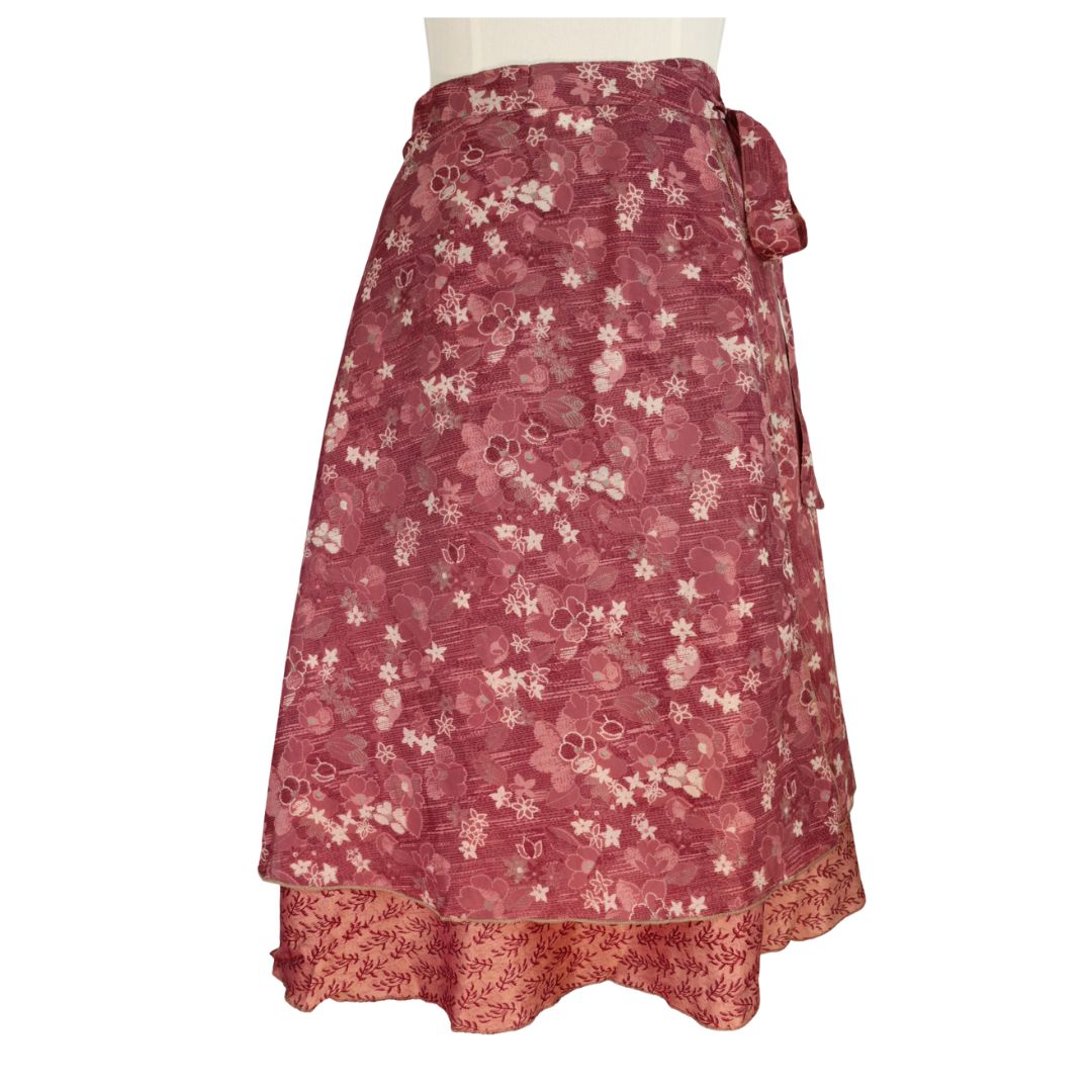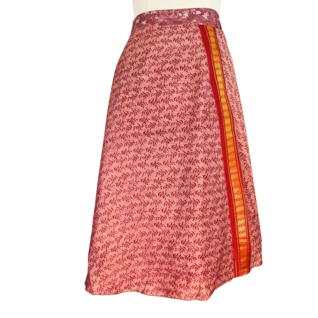 Traditionally Saris are often flamboyant and brightly coloured, frequently embroidered, and made from silk, cotton, or, in recent years, synthetic cloth such as viscose and polyester. We use retro Sari cloth in the majority of our garments so silk is a high component. It is not uncommon to find chiffon or georgette added into the mix which is why we refer to the skirts as a silk blend. We also use 'end of roll' sari fabrics.