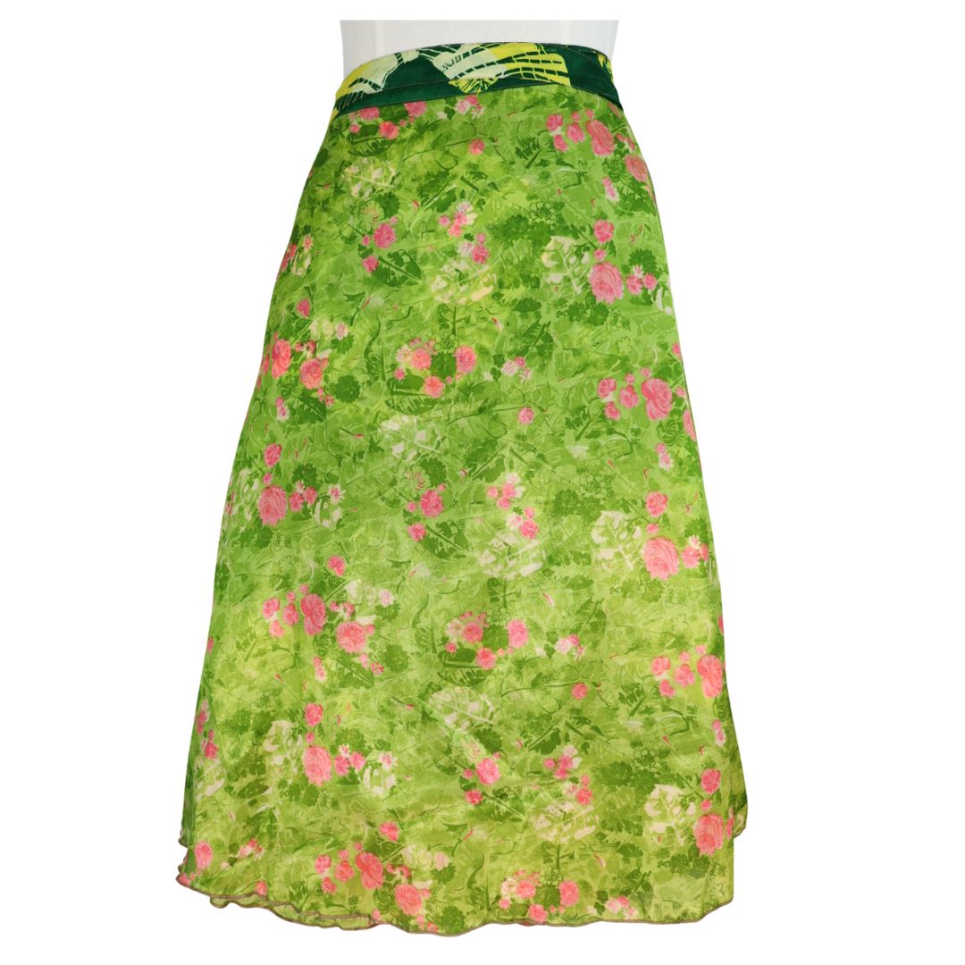Traditionally Saris are often flamboyant and brightly coloured, frequently embroidered, and made from silk, cotton, or, in recent years, synthetic cloth such as viscose and polyester. We use retro Sari cloth in the majority of our garments so silk is a high component. It is not uncommon to find chiffon or georgette added into the mix which is why we refer to the skirts as a silk blend. We also use 'end of roll' sari fabrics.