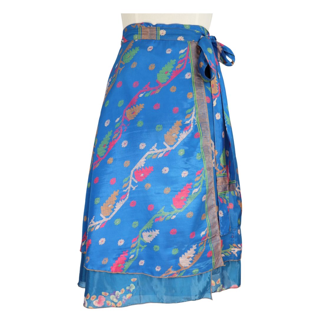 Traditionally Saris are often flamboyant and brightly coloured, frequently embroidered, and made from silk, cotton, or, in recent years, synthetic cloth such as viscose and polyester. We use retro Sari cloth in the majority of our garments so silk is a high component. It is not uncommon to find chiffon or georgette added into the mix which is why we refer to the skirts as a silk blend. We also use 'end of roll' sari fabrics.