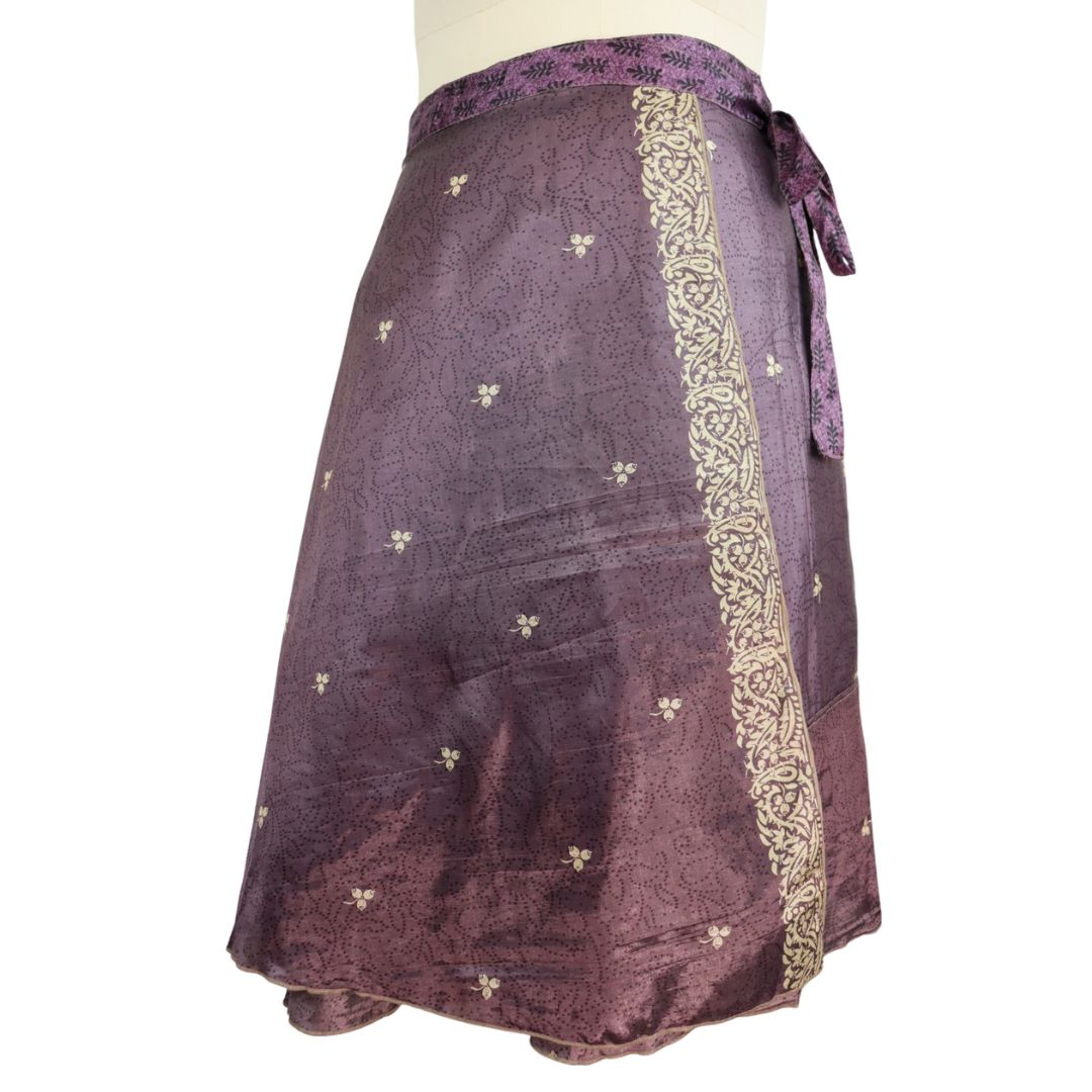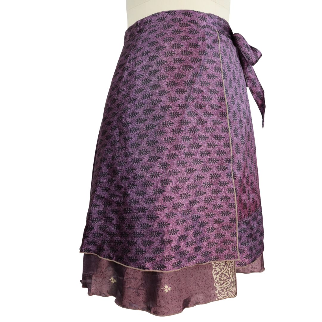 Traditionally Saris are often flamboyant and brightly coloured, frequently embroidered, and made from silk, cotton, or, in recent years, synthetic cloth such as viscose and polyester. We use retro Sari cloth in the majority of our garments so silk is a high component. It is not uncommon to find chiffon or georgette added into the mix which is why we refer to the skirts as a silk blend. We also use 'end of roll' sari fabrics.