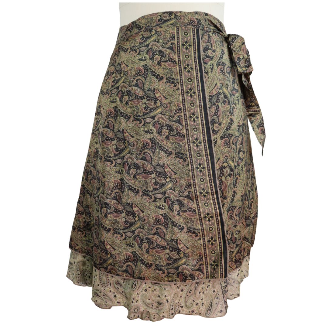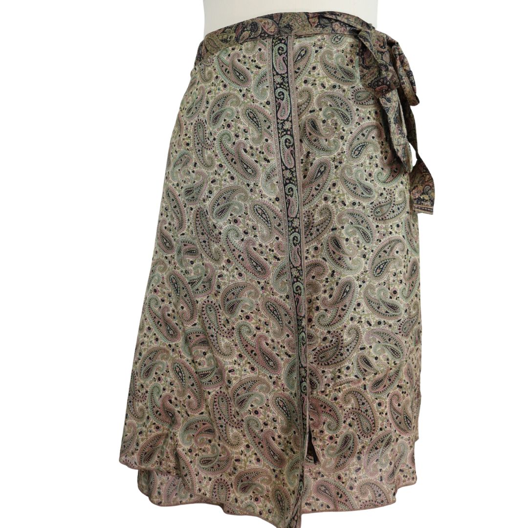 Traditionally Saris are often flamboyant and brightly coloured, frequently embroidered, and made from silk, cotton, or, in recent years, synthetic cloth such as viscose and polyester. We use retro Sari cloth in the majority of our garments so silk is a high component. It is not uncommon to find chiffon or georgette added into the mix which is why we refer to the skirts as a silk blend. We also use 'end of roll' sari fabrics.