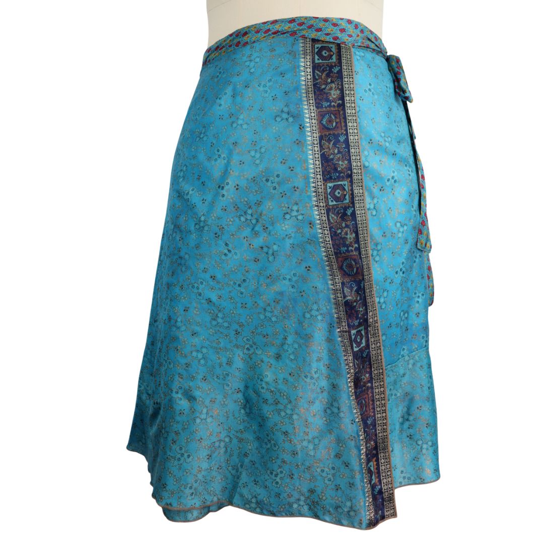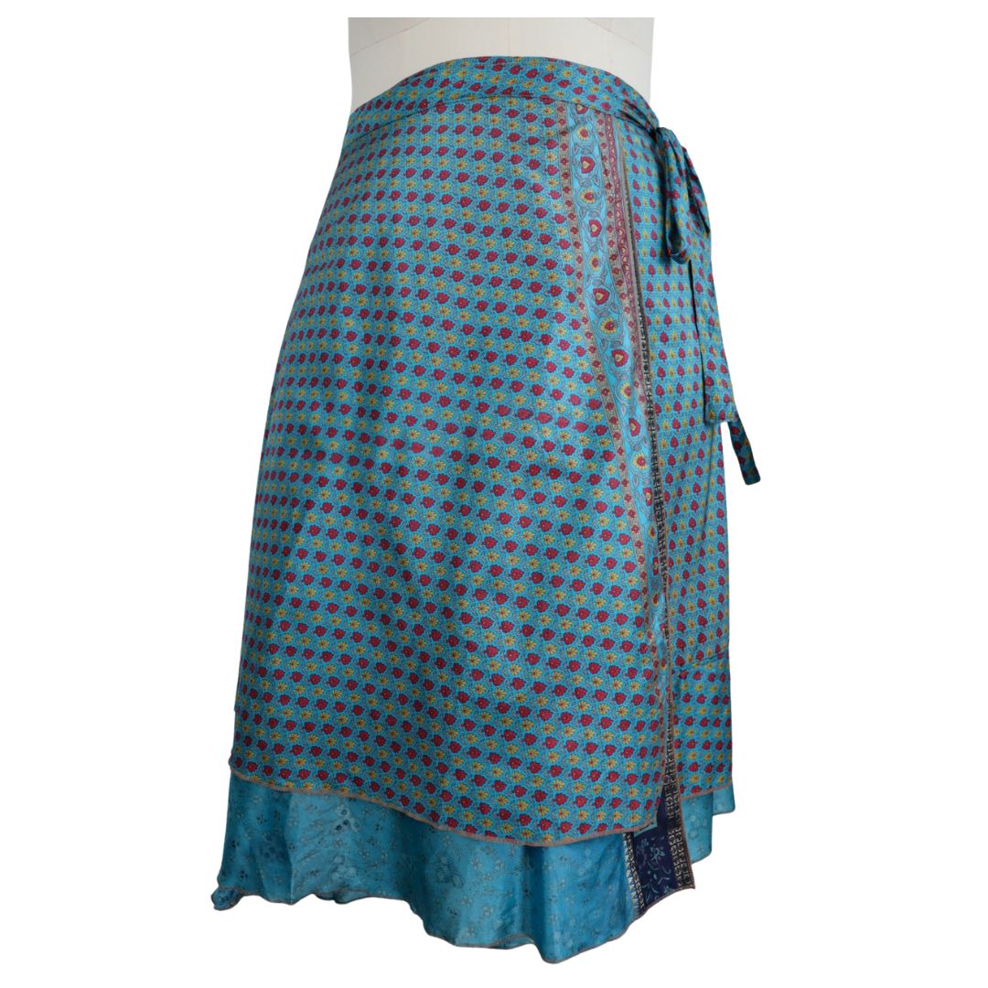Traditionally Saris are often flamboyant and brightly coloured, frequently embroidered, and made from silk, cotton, or, in recent years, synthetic cloth such as viscose and polyester. We use retro Sari cloth in the majority of our garments so silk is a high component. It is not uncommon to find chiffon or georgette added into the mix which is why we refer to the skirts as a silk blend. We also use 'end of roll' sari fabrics.
