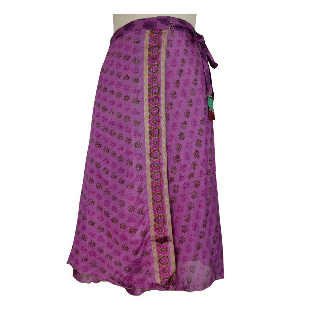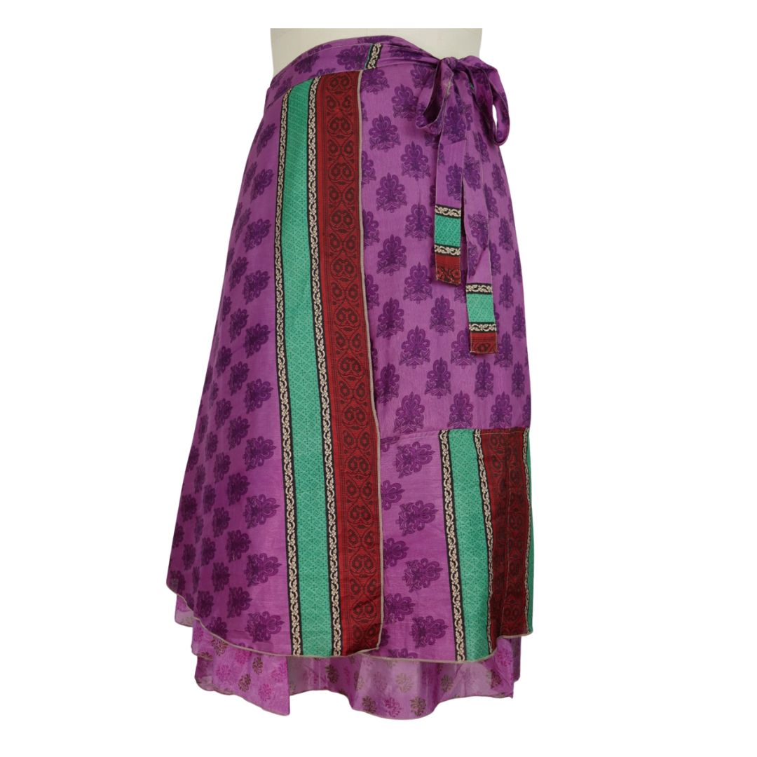 Traditionally Saris are often flamboyant and brightly coloured, frequently embroidered, and made from silk, cotton, or, in recent years, synthetic cloth such as viscose and polyester. We use retro Sari cloth in the majority of our garments so silk is a high component. It is not uncommon to find chiffon or georgette added into the mix which is why we refer to the skirts as a silk blend. We also use 'end of roll' sari fabrics.