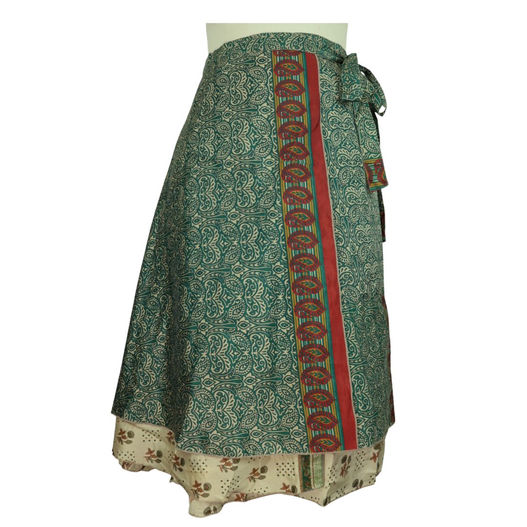 Traditionally Saris are often flamboyant and brightly coloured, frequently embroidered, and made from silk, cotton, or, in recent years, synthetic cloth such as viscose and polyester. We use retro Sari cloth in the majority of our garments so silk is a high component. It is not uncommon to find chiffon or georgette added into the mix which is why we refer to the skirts as a silk blend. We also use 'end of roll' sari fabrics.