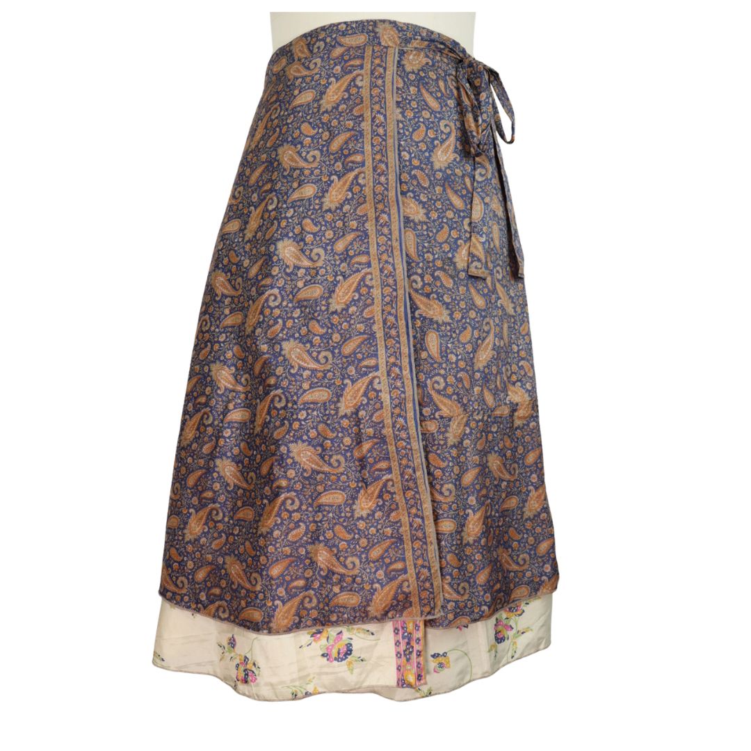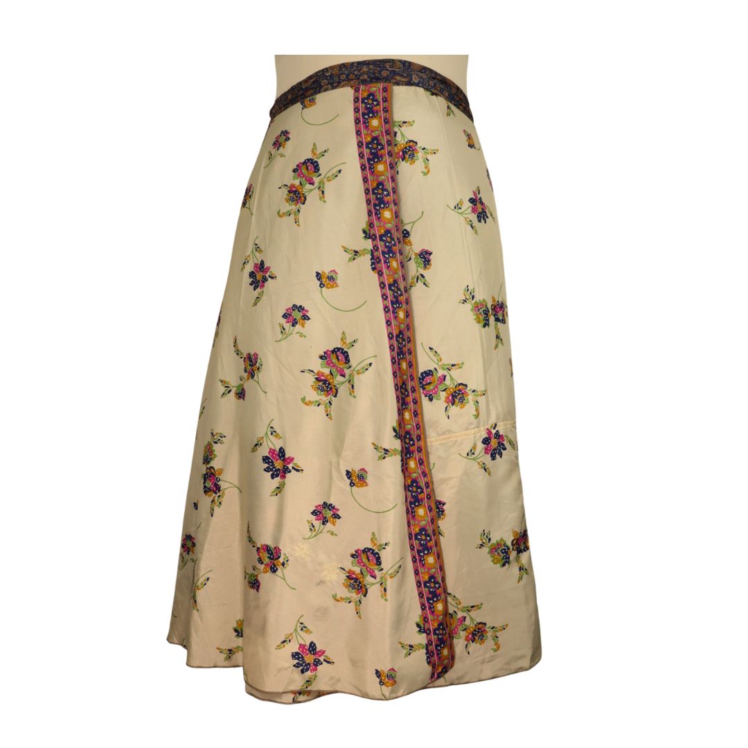Traditionally Saris are often flamboyant and brightly coloured, frequently embroidered, and made from silk, cotton, or, in recent years, synthetic cloth such as viscose and polyester. We use retro Sari cloth in the majority of our garments so silk is a high component. It is not uncommon to find chiffon or georgette added into the mix which is why we refer to the skirts as a silk blend. We also use 'end of roll' sari fabrics.