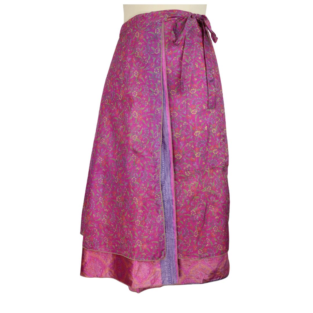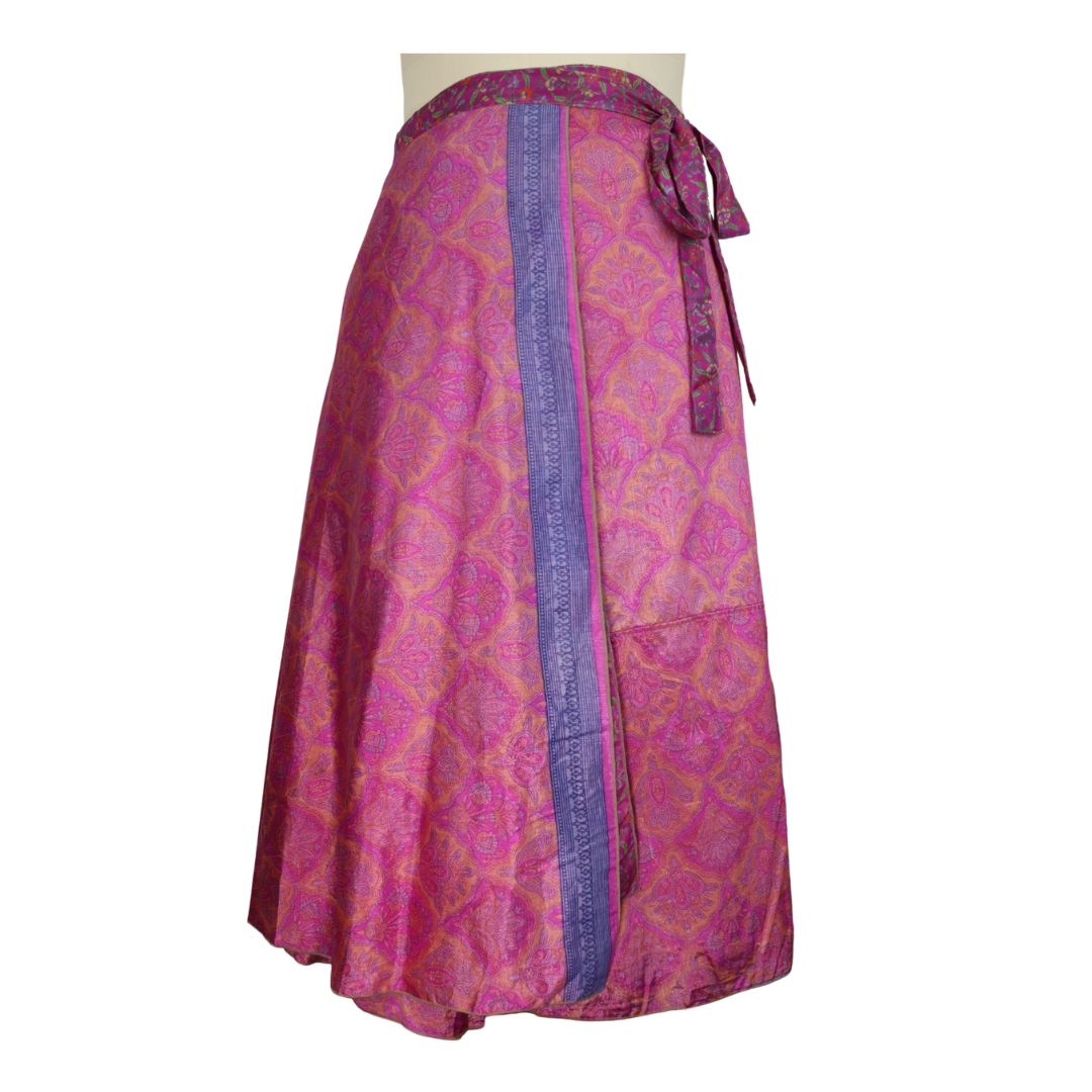 Traditionally Saris are often flamboyant and brightly coloured, frequently embroidered, and made from silk, cotton, or, in recent years, synthetic cloth such as viscose and polyester. We use retro Sari cloth in the majority of our garments so silk is a high component. It is not uncommon to find chiffon or georgette added into the mix which is why we refer to the skirts as a silk blend. We also use 'end of roll' sari fabrics.