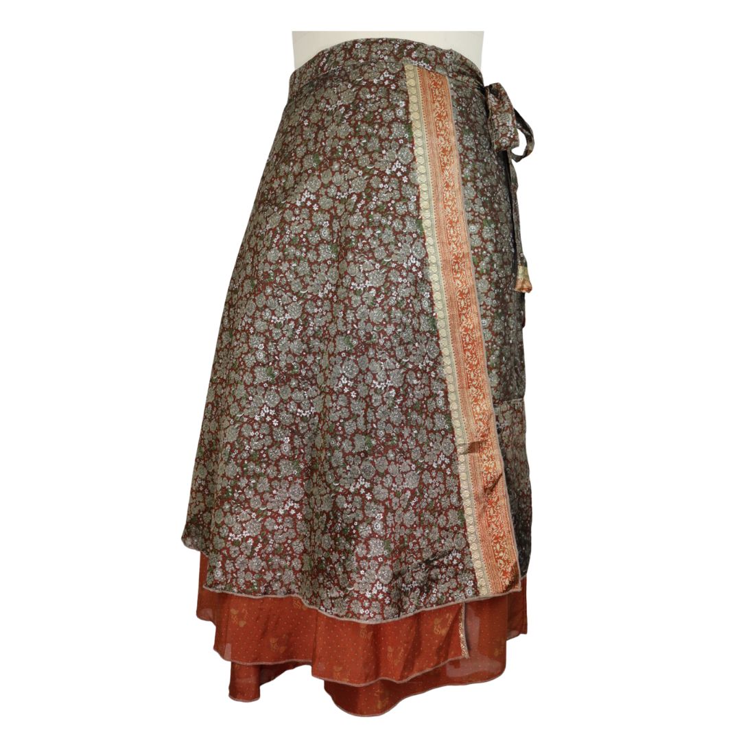 Traditionally Saris are often flamboyant and brightly coloured, frequently embroidered, and made from silk, cotton, or, in recent years, synthetic cloth such as viscose and polyester. We use retro Sari cloth in the majority of our garments so silk is a high component. It is not uncommon to find chiffon or georgette added into the mix which is why we refer to the skirts as a silk blend. We also use 'end of roll' sari fabrics.