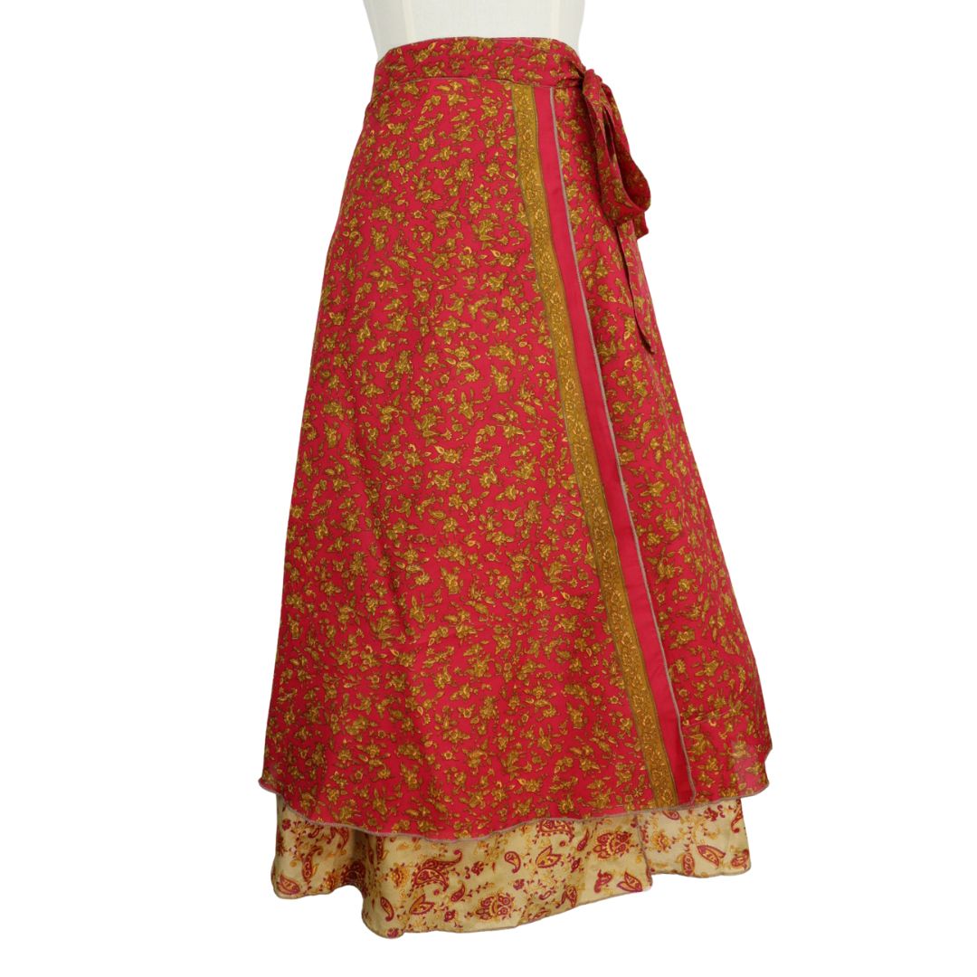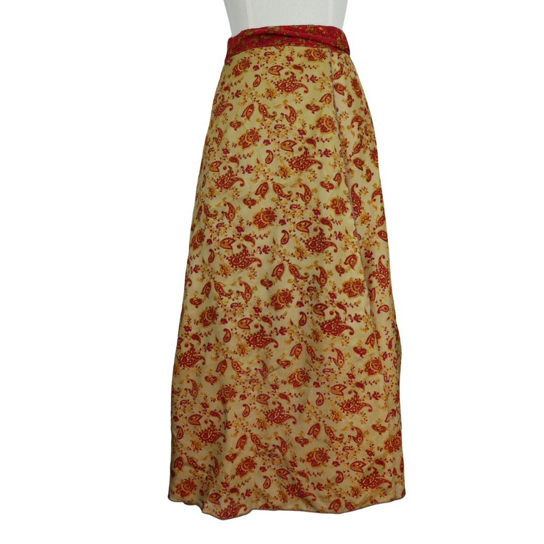Traditionally Saris are often flamboyant and brightly coloured, frequently embroidered, and made from silk, cotton, or, in recent years, synthetic cloth such as viscose and polyester. We use retro Sari cloth in the majority of our garments so silk is a high component. It is not uncommon to find chiffon or georgette added into the mix which is why we refer to the skirts as a silk blend. We also use 'end of roll' sari fabrics.