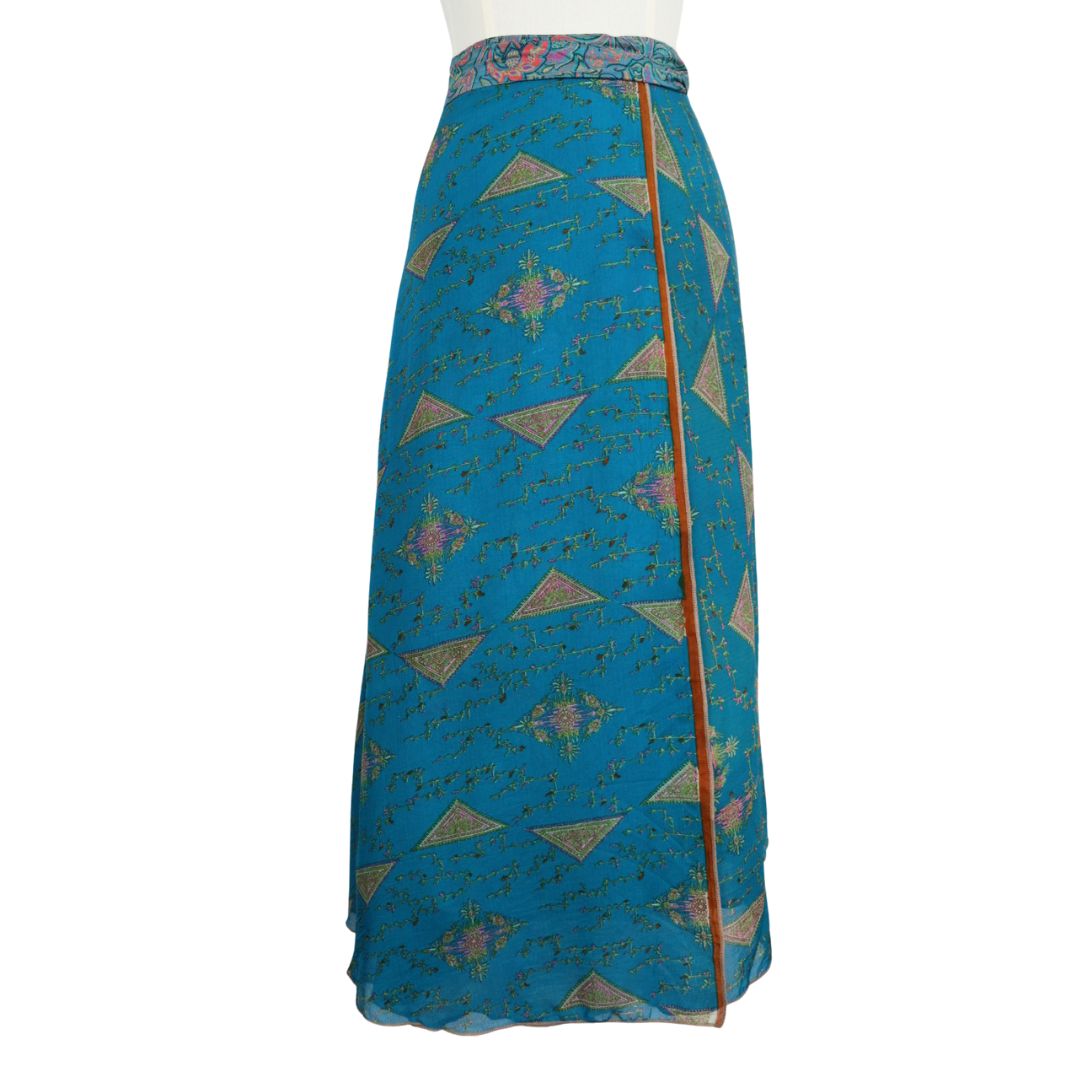 Traditionally Saris are often flamboyant and brightly coloured, frequently embroidered, and made from silk, cotton, or, in recent years, synthetic cloth such as viscose and polyester. We use retro Sari cloth in the majority of our garments so silk is a high component. It is not uncommon to find chiffon or georgette added into the mix which is why we refer to the skirts as a silk blend. We also use 'end of roll' sari fabrics.