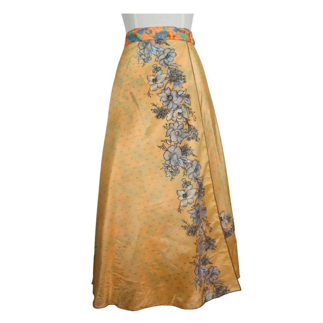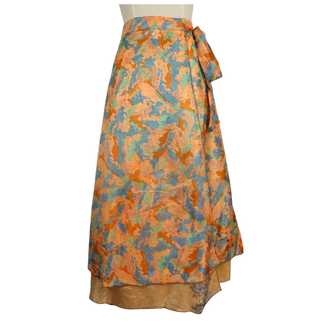 Traditionally Saris are often flamboyant and brightly coloured, frequently embroidered, and made from silk, cotton, or, in recent years, synthetic cloth such as viscose and polyester. We use retro Sari cloth in the majority of our garments so silk is a high component. It is not uncommon to find chiffon or georgette added into the mix which is why we refer to the skirts as a silk blend. We also use 'end of roll' sari fabrics.