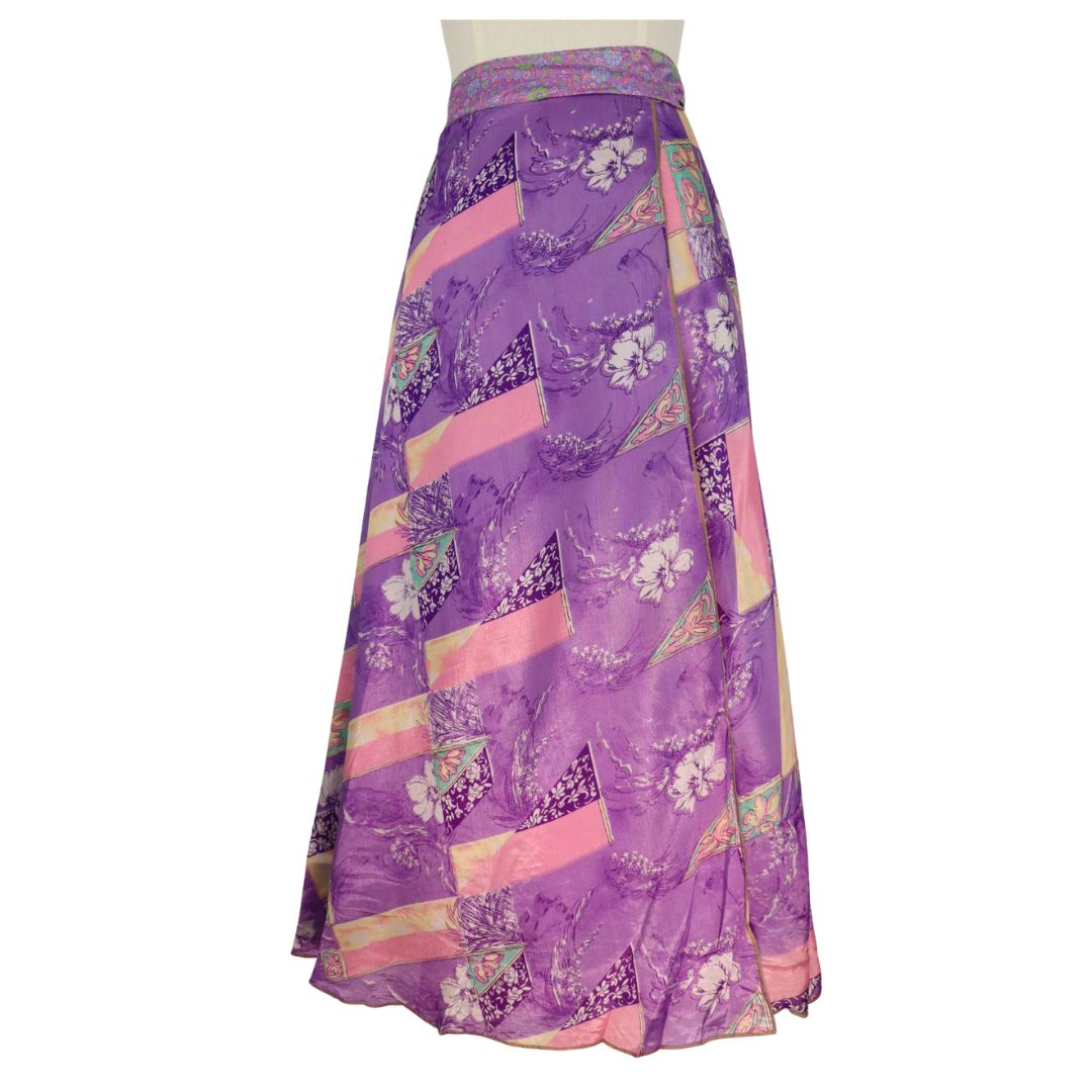 Traditionally Saris are often flamboyant and brightly coloured, frequently embroidered, and made from silk, cotton, or, in recent years, synthetic cloth such as viscose and polyester. We use retro Sari cloth in the majority of our garments so silk is a high component. It is not uncommon to find chiffon or georgette added into the mix which is why we refer to the skirts as a silk blend. We also use 'end of roll' sari fabrics.