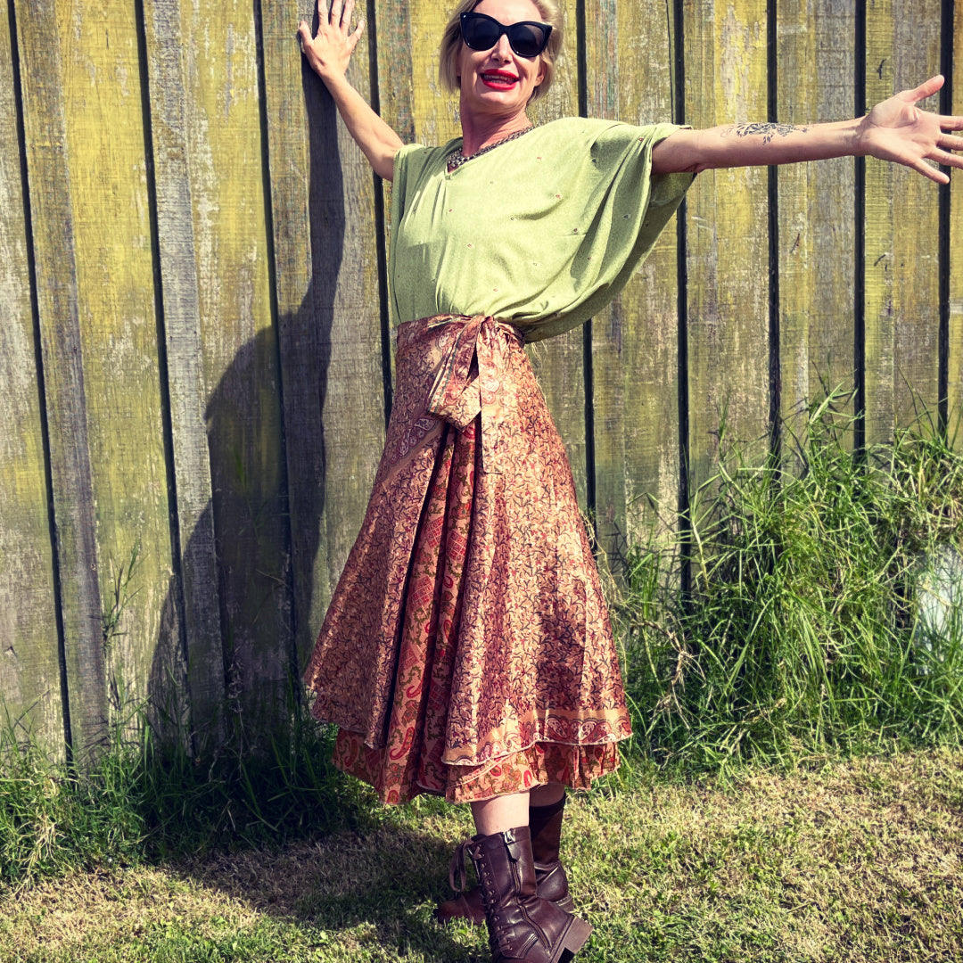 Traditionally Saris are often flamboyant and brightly coloured, frequently embroidered, and made from silk, cotton, or, in recent years, synthetic cloth such as viscose and polyester. We use retro Sari cloth in the majority of our garments so silk is a high component. It is not uncommon to find chiffon or georgette added into the mix which is why we refer to the skirts as a silk blend. We also use 'end of roll' sari fabrics.