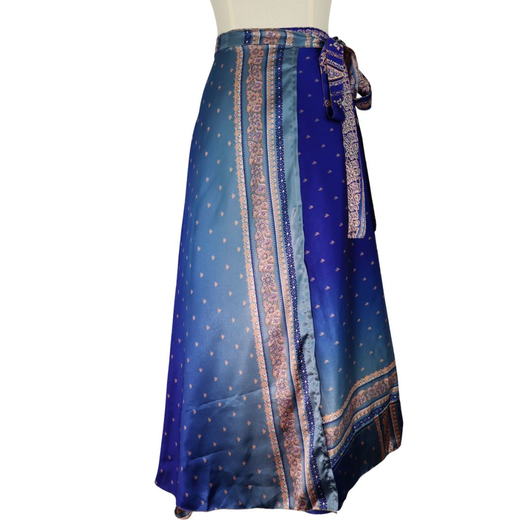 Traditionally Saris are often flamboyant and brightly coloured, frequently embroidered, and made from silk, cotton, or, in recent years, synthetic cloth such as viscose and polyester. We use retro Sari cloth in the majority of our garments so silk is a high component. It is not uncommon to find chiffon or georgette added into the mix which is why we refer to the skirts as a silk blend. We also use 'end of roll' sari fabrics.