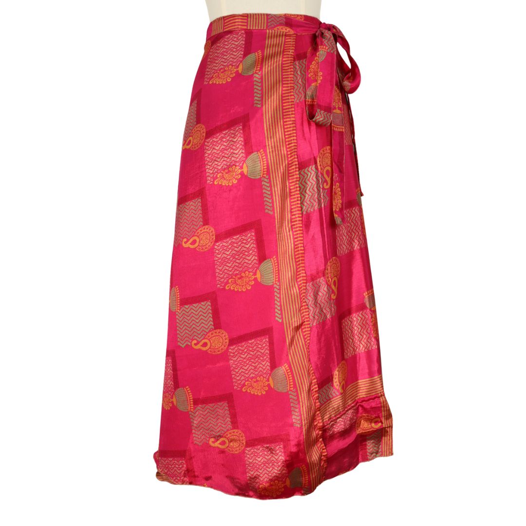 Traditionally Saris are often flamboyant and brightly coloured, frequently embroidered, and made from silk, cotton, or, in recent years, synthetic cloth such as viscose and polyester. We use retro Sari cloth in the majority of our garments so silk is a high component. It is not uncommon to find chiffon or georgette added into the mix which is why we refer to the skirts as a silk blend. We also use 'end of roll' sari fabrics.