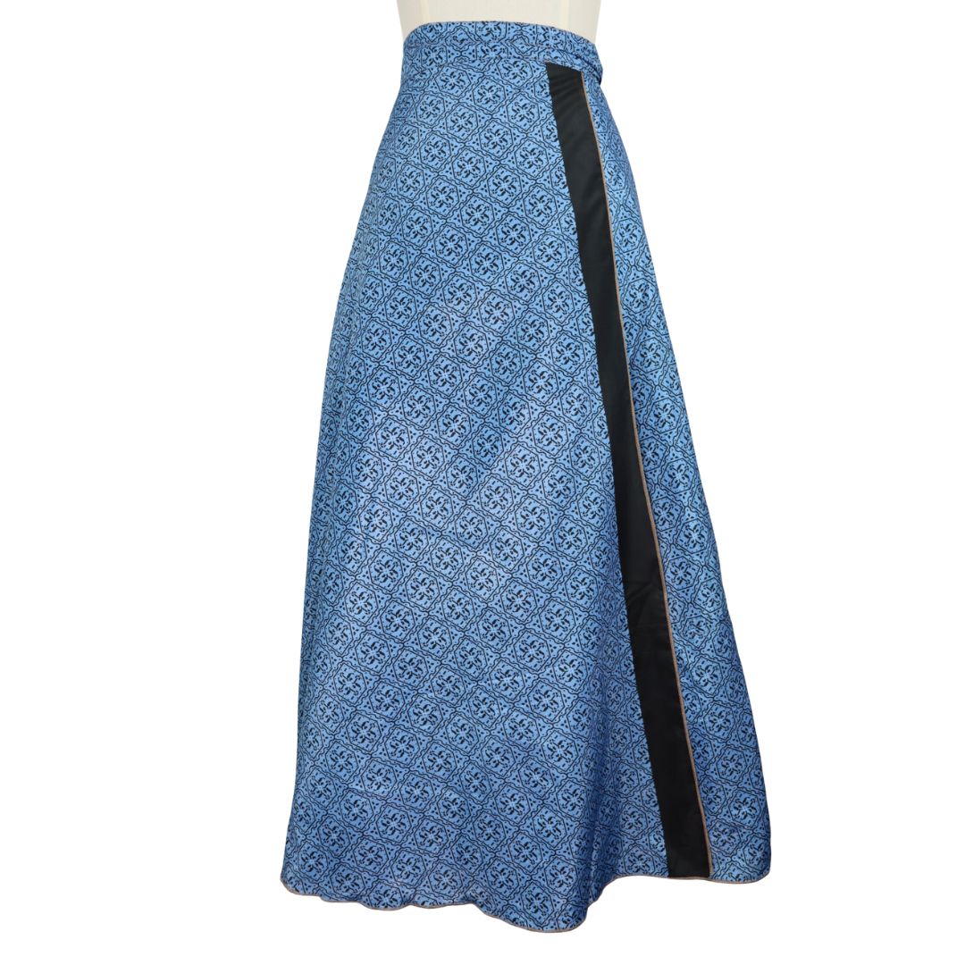 Traditionally Saris are often flamboyant and brightly coloured, frequently embroidered, and made from silk, cotton, or, in recent years, synthetic cloth such as viscose and polyester. We use retro Sari cloth in the majority of our garments so silk is a high component. It is not uncommon to find chiffon or georgette added into the mix which is why we refer to the skirts as a silk blend. We also use 'end of roll' sari fabrics.