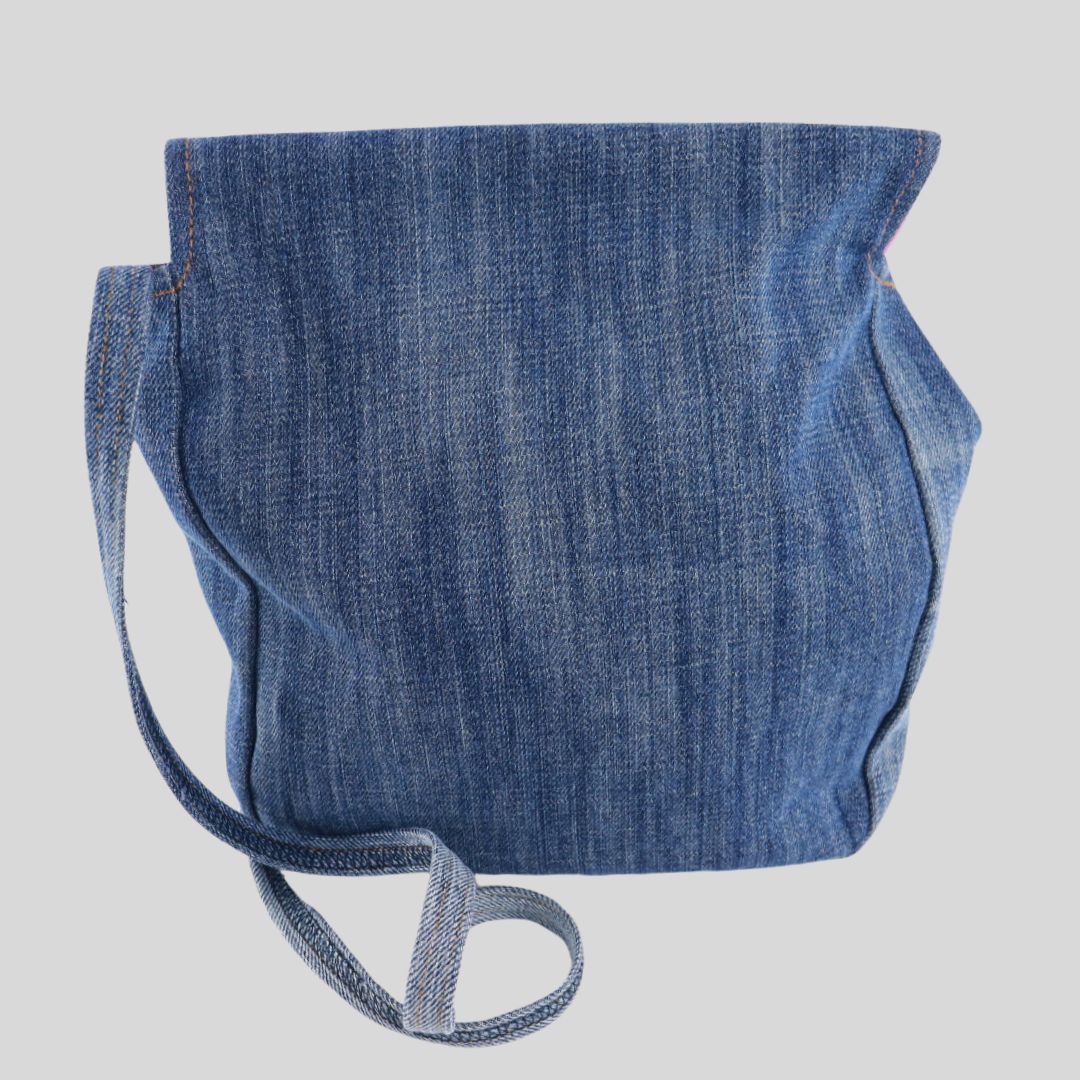 Made from Levi Strauss jeans. The approximate dimensions are L24cms x H26cms x W4cms. The strap is 97cms long. Each bag is lined with pink cotton poplin. There are internal pockets on both sides. Velcro fastens the front flap.