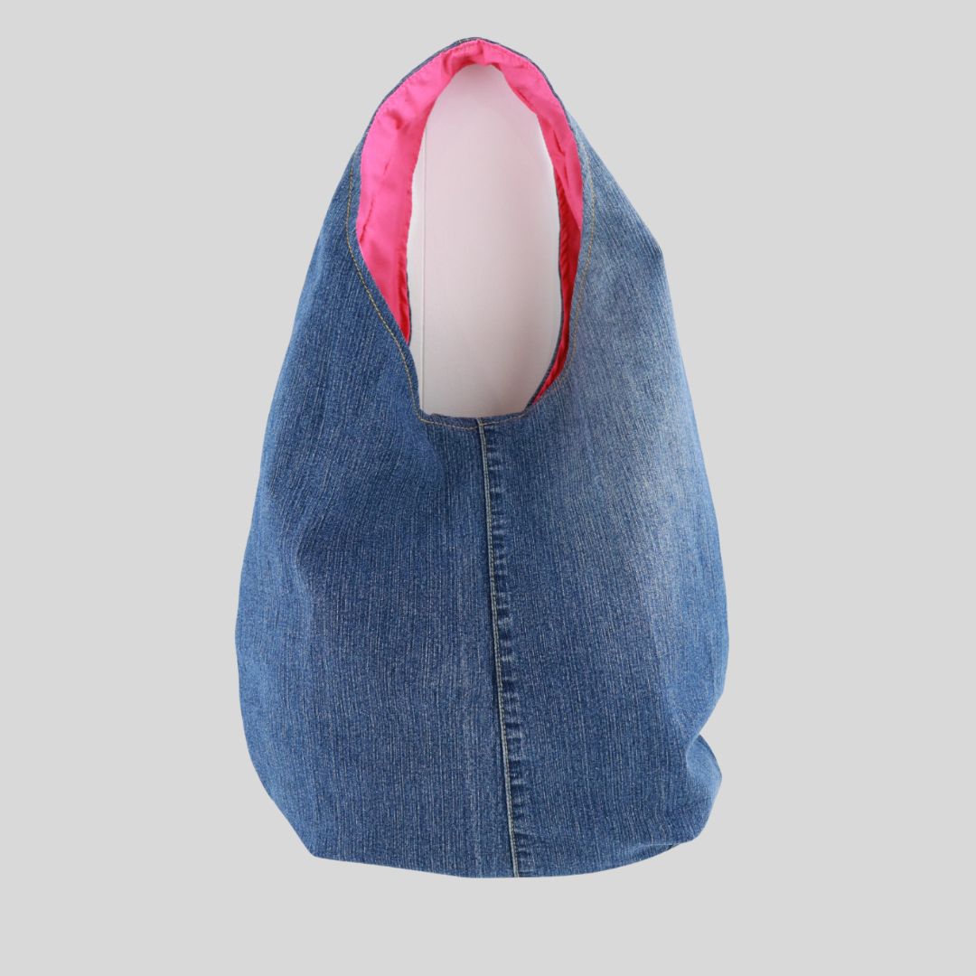 Made from jeans. The approximate dimensions are L40cms x H35cms. Each bag is lined with pink cotton poplin. There are internal pockets on both sides.