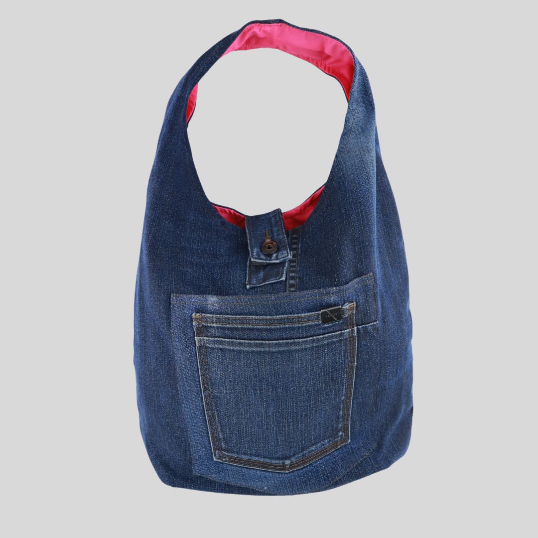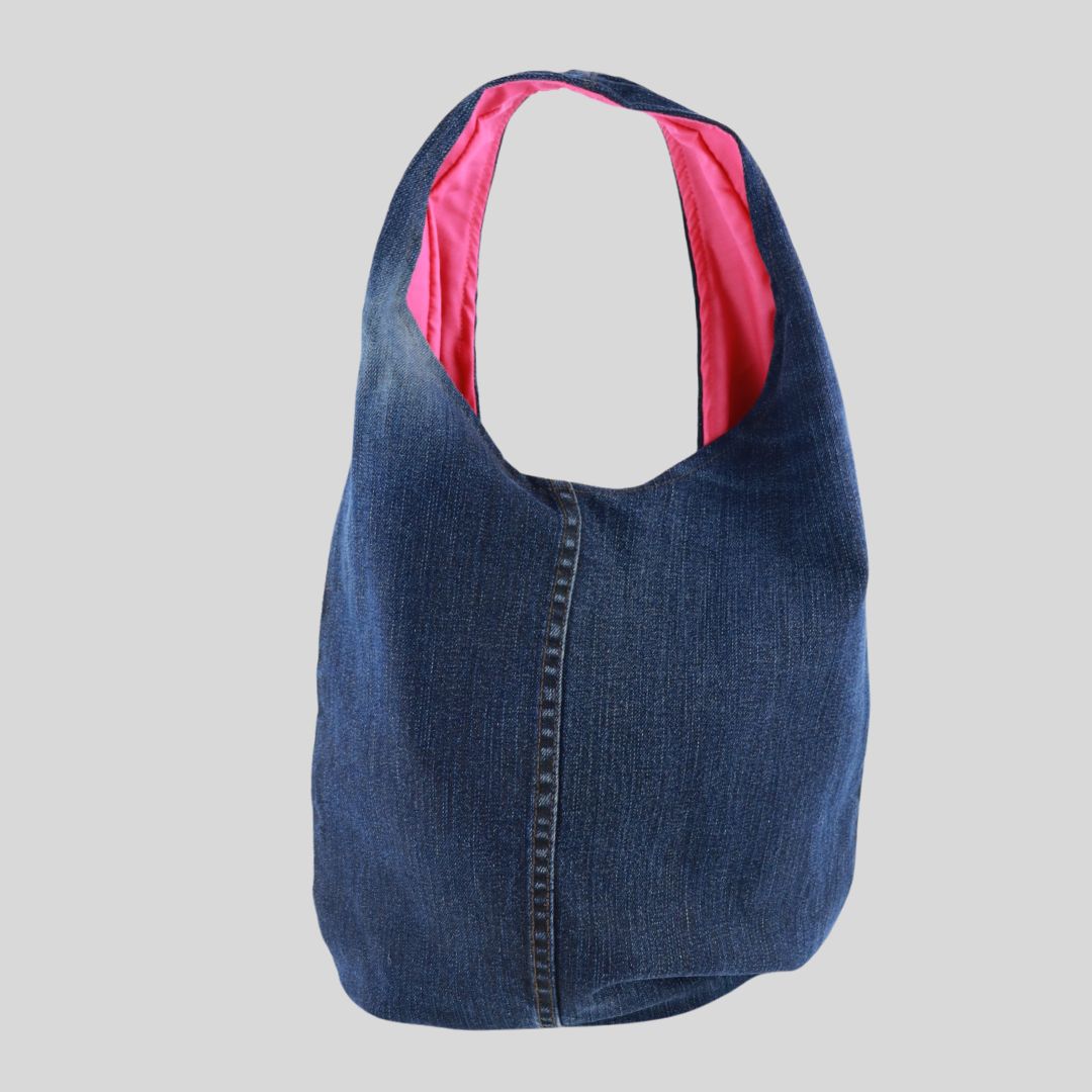 Made from jeans. The approximate dimensions are L40cms x H35cms. Each bag is lined with pink cotton poplin. There are internal pockets on both sides.
