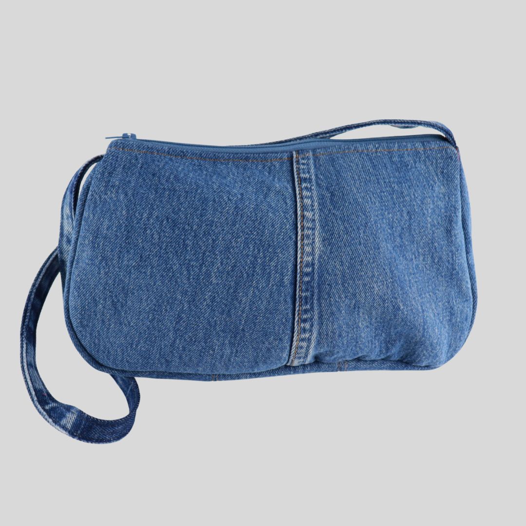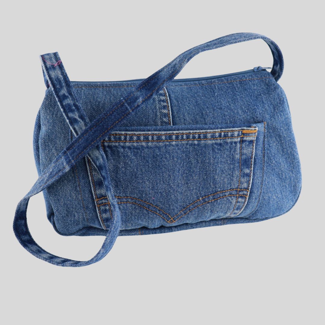 Made from jeans. The approximate dimensions are L30cms x H17cms x W8cms. The strap is 79cms long. Each bag is lined with pink cotton poplin. There are internal pockets on both sides. A zip to fasten.