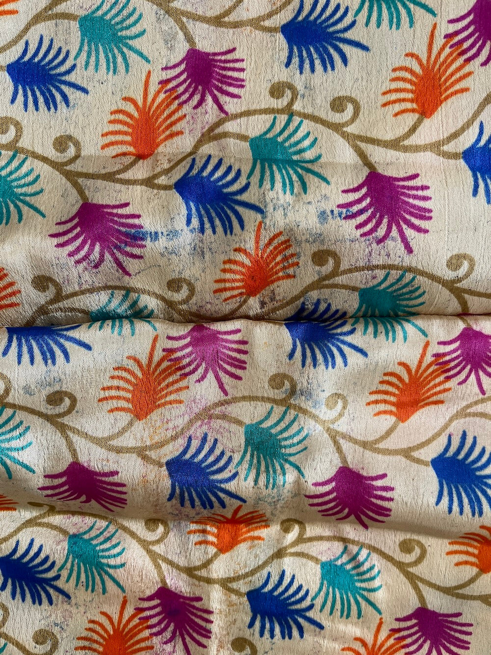 Traditionally Saris are often flamboyant and brightly coloured, frequently embroidered, and made from silk, cotton, or, in recent years, synthetic cloth such as viscose and polyester. We use retro Sari cloth in the majority of our garments so silk is a high component. It is not uncommon to find chiffon or georgette added into the mix which is why we refer to the skirts as a silk blend. We also use 'end of roll' sari fabrics.